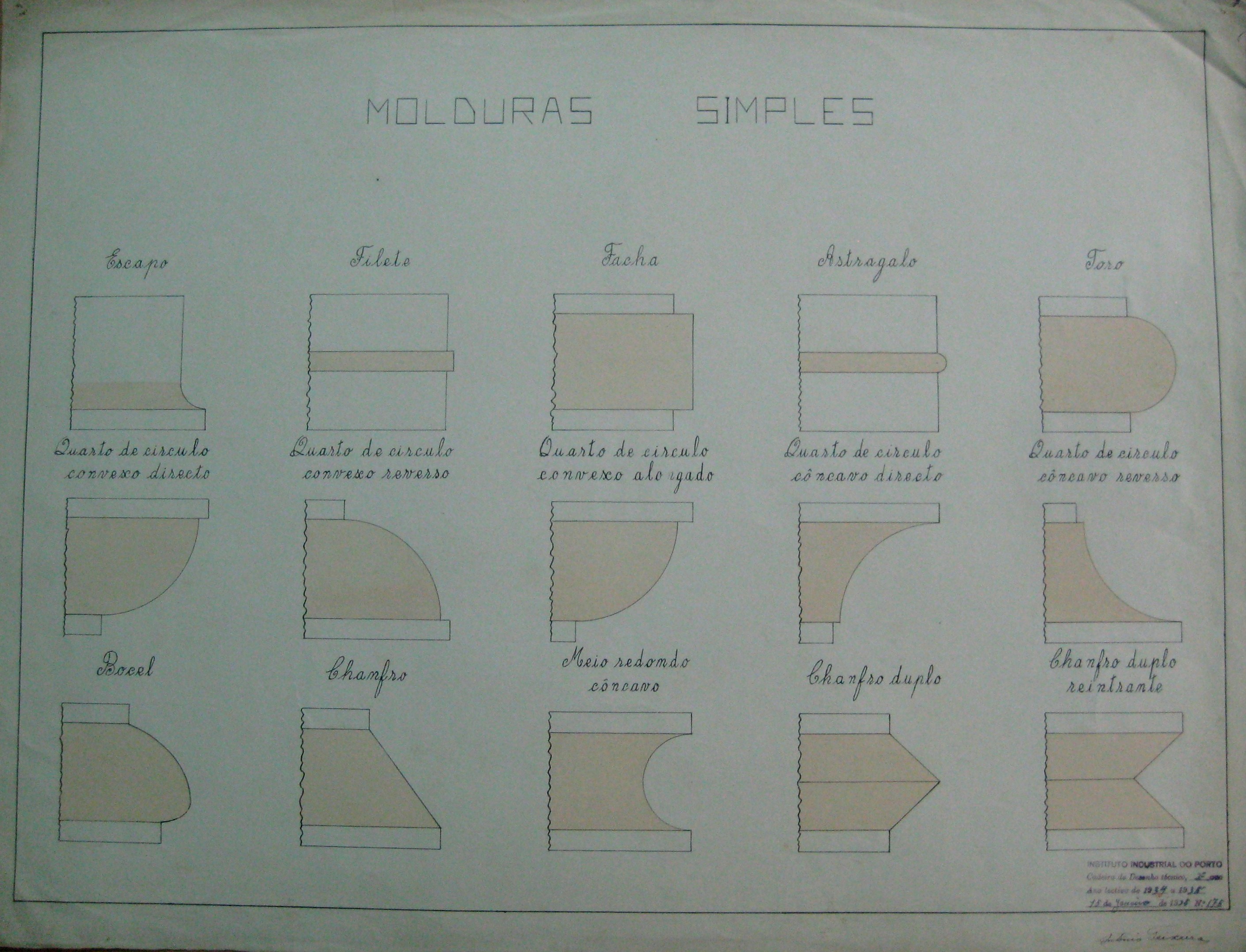 | Observações: | O trabalho curricular possui o carimbo do Instituto Industrial do Porto, em vigor entre 1864 a 1886, de 1918 a 1924 e de 1933 a 1974. Contém a seguinte descrição: "Cadeira de Desenho Técnico, 2º Ano; Ano Lectivo de 1934 a 1935; 15 de Janeiro de 1935, Nº 175". Assinado por: António Teixeira |