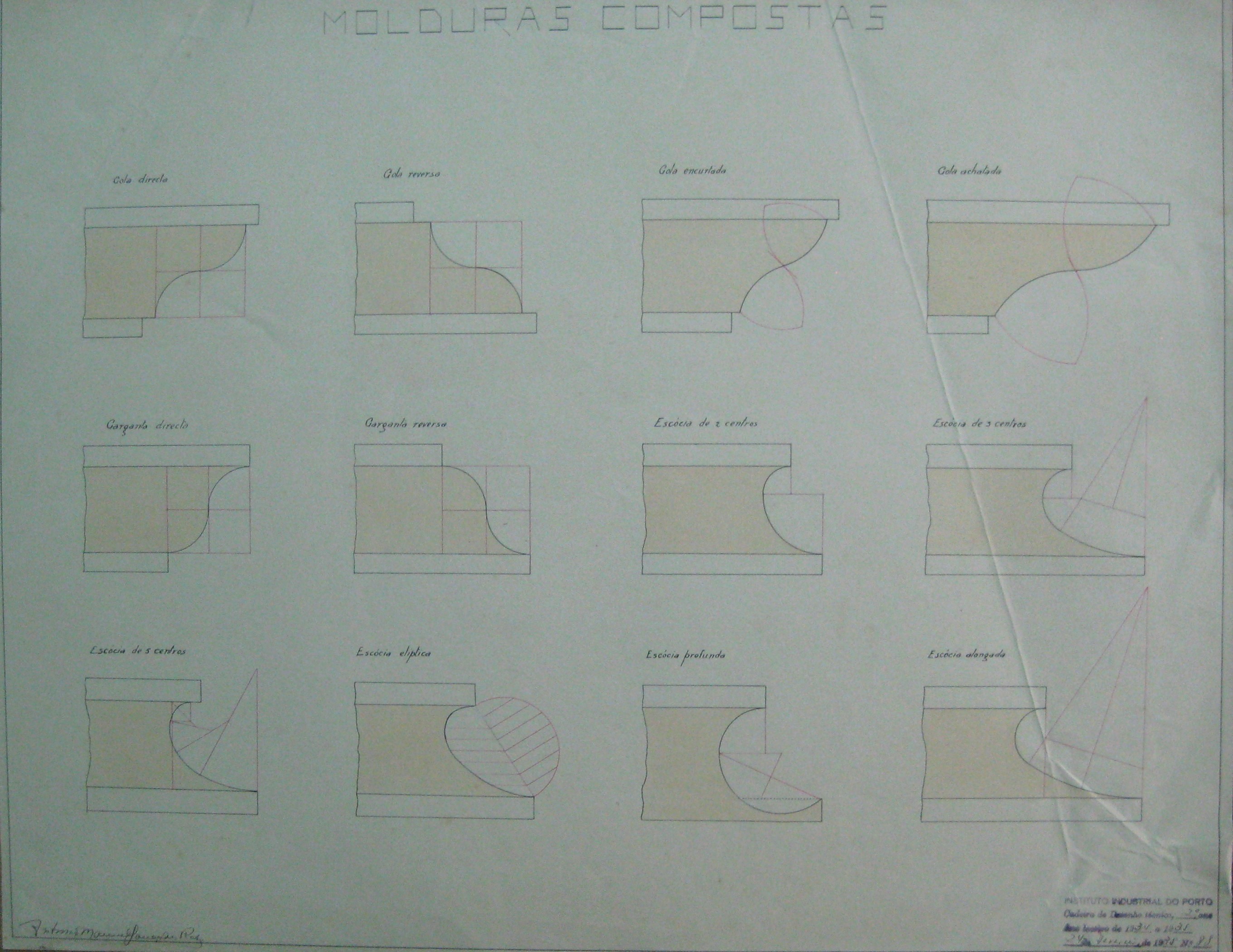| Descrição: | O trabalho curricular apresenta doze desenhos de molduras compostas, designadas por: "Gola Directa; Gola Reversa; Gola Encurtada; Gola Achatada; Garganta Directa; Garganta Reversa; Escócia de 2 centros; Escócia de 3 centros; Escócia de 5 centros; Escócia Eliptica; Escócia Profunda; Escócia Alongada." |