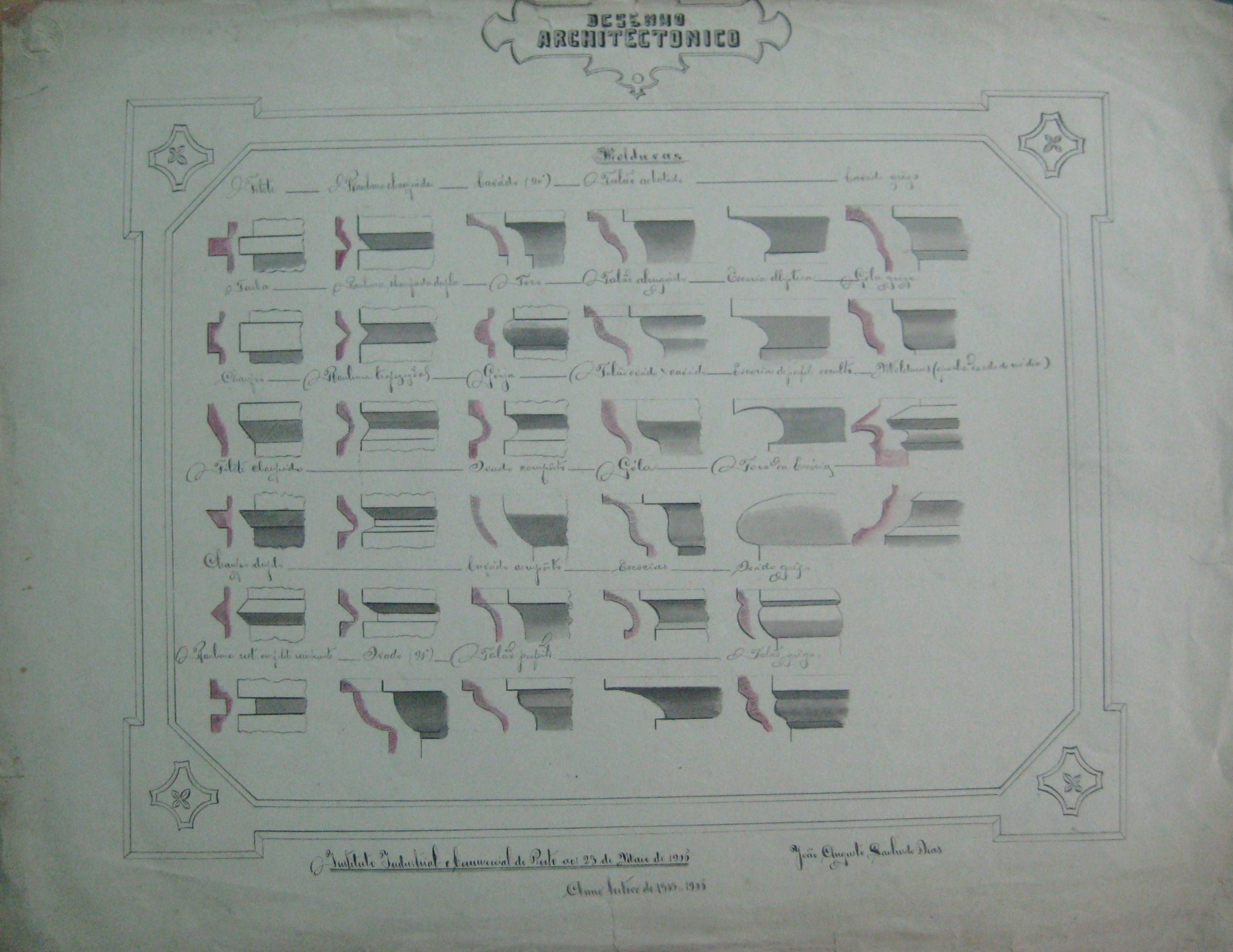 | Descrição: | O trabalho curricular apresenta vários desenhos de molduras. Estão designados por: Filete; Facha; Chanfro; Gola; Escócia, Toro, entre outros. |