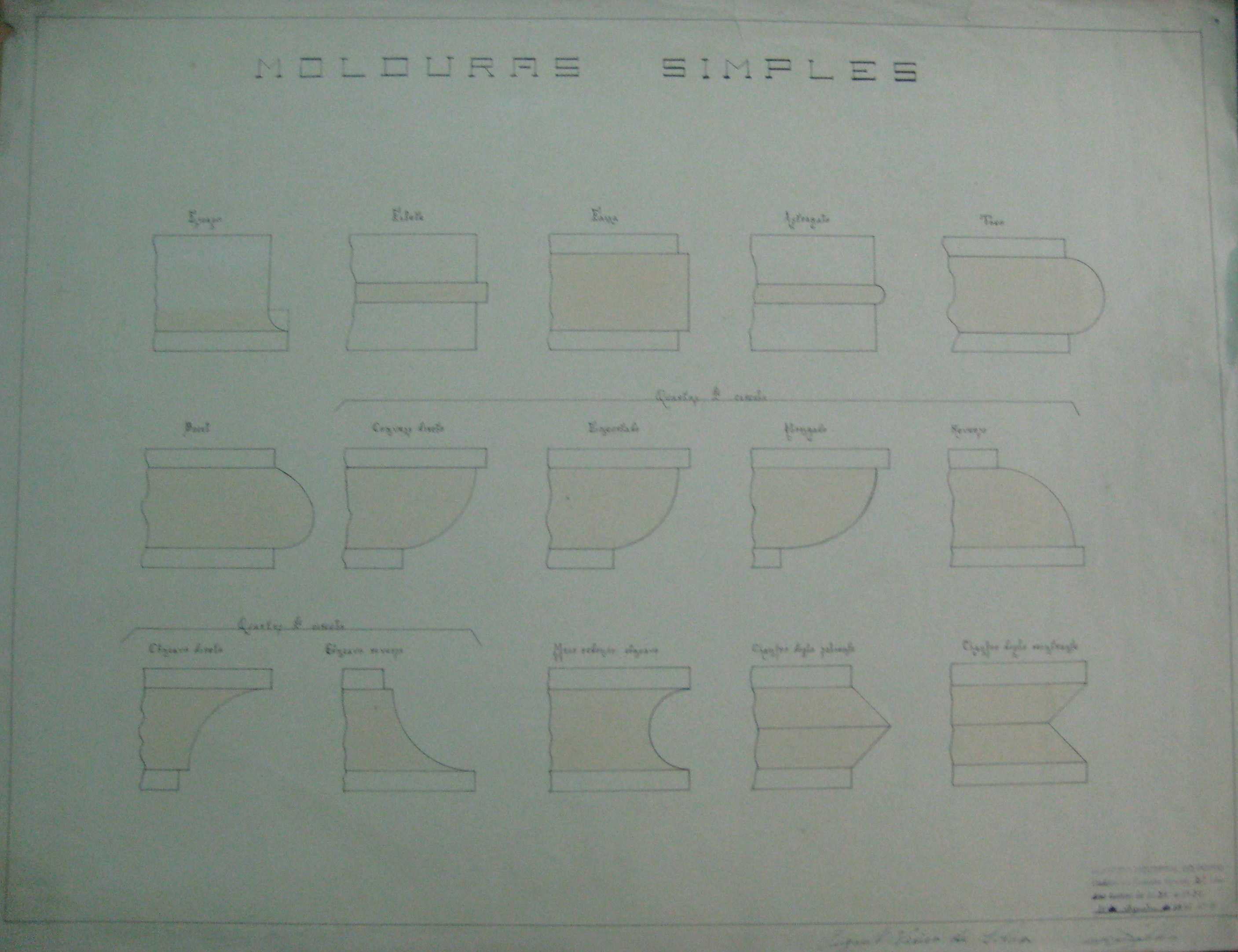 | Descrição: | O trabalho curricular apresenta quinze desenhos de molduras simples. Estes, estão designados por: "Escapo; Filete; Faixa; Astragalo; Toro; Bocel; Quartos de Círculo:Convexo Directo; Encurtado; Alongado; Reverso; Côncavo directo; Côncavo Reverso; Meio Redondo Côncavo; Chanfro Duplo Saliente; Chanfro Duplo Reintrante." |