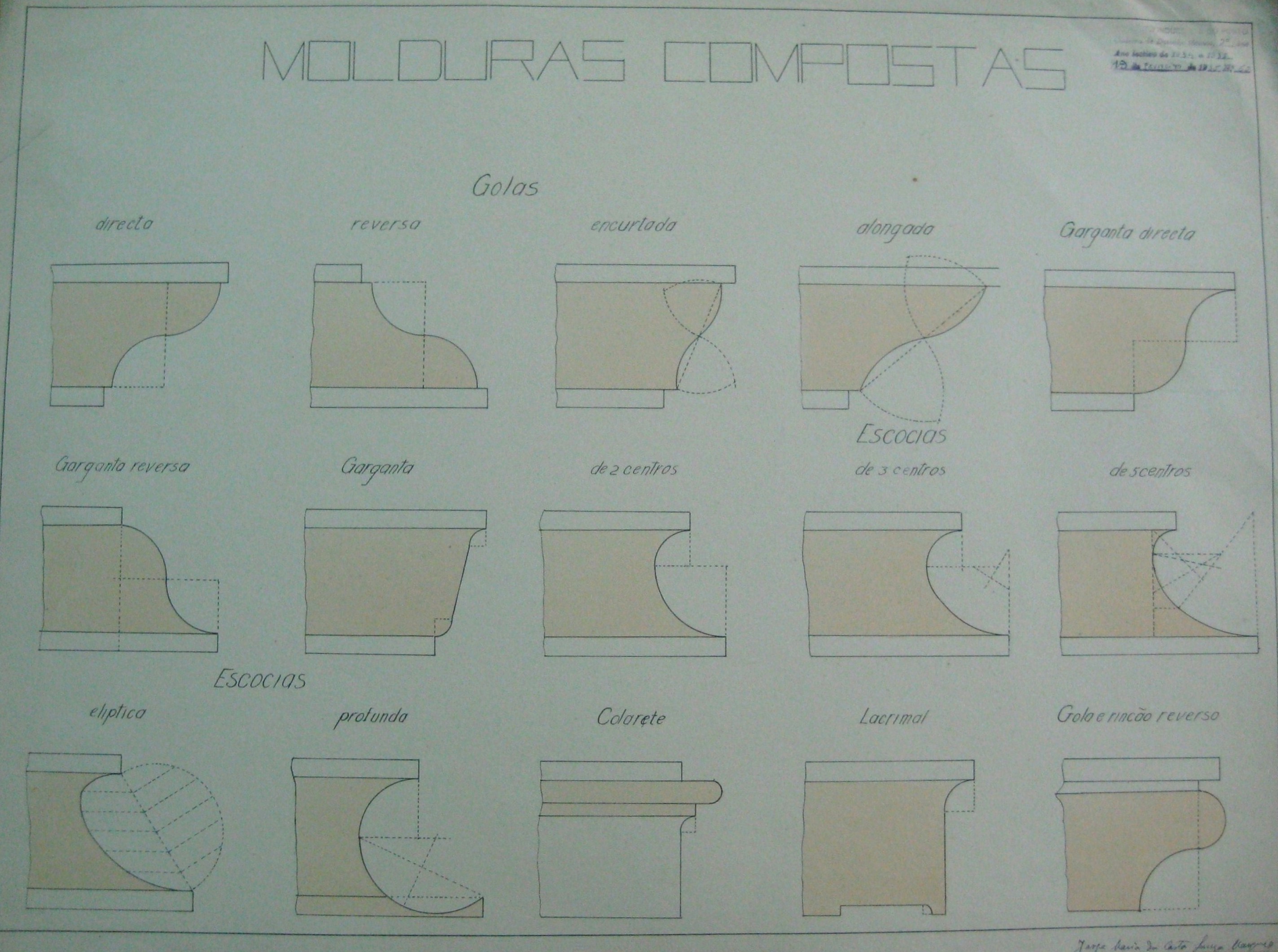 | Descrição: | O trabalho curricular contém quinze desenhos de molduras compostas. Estes, estão designados por: "Golas; Gargantas; Escócias." As golas são de vários tipos, sendo denominadas por: Directa; Reversa; Encurtada; Alongada; As gargantas são denominadas por: Directa; Reversa; e Garganta. As escócias estão denominadas por: Escócias de 2 centros; de 3 centros; de 5 centros; Elíptica e Profunda; O trabalho contém outros exemplos de molduras compostas designadas por: Colarete; Lacrimal e Gola e rincão reverso. |