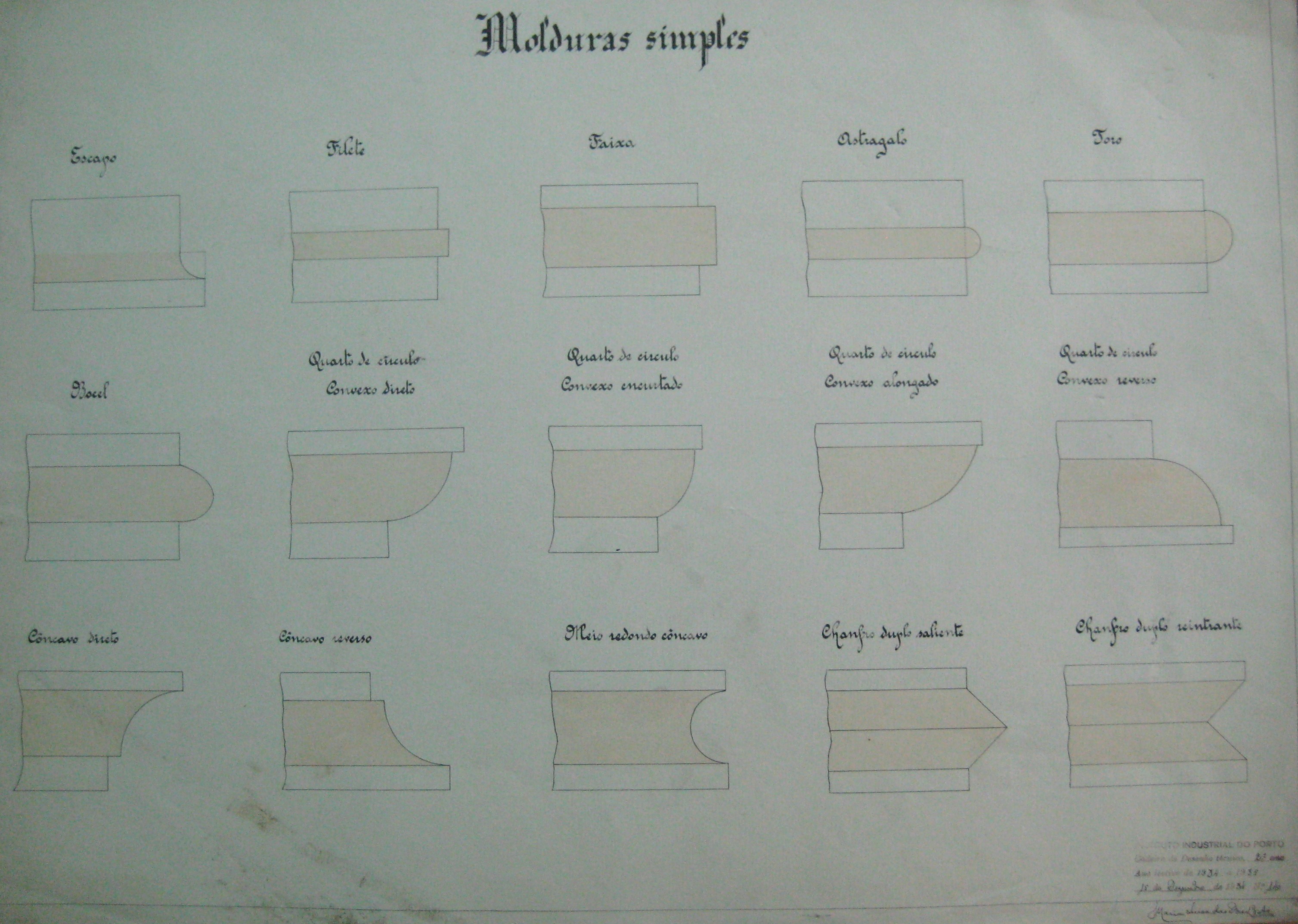 | Descrição: | O trabalho curricular contém quinze desenhos de molduras simples. Estão designados por: "Escapo; Filete; Faixa; Astragalo; Toro; Bocel; Quarto de Círculo Convexo Directo; Quarto de Círculo Convexo Encurtado; Quarto de Círculo Convexo Alongado; Quarto de Círculo Convexo Reverso; Côncavo Directo; Côncavo Reverso; Meio Redondo Côncavo; Chanfro Duplo Saliente; Chanfro Duplo Reintrante;" |