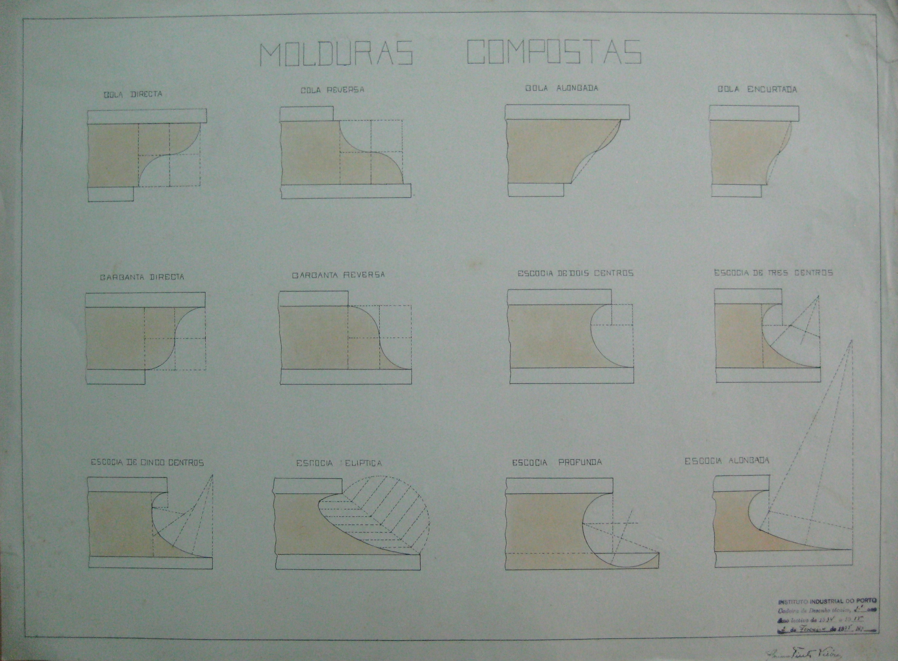 | Descrição: | O trabalho curricular contém doze desenhos de molduras compostas. Estas molduras estão denominadas por: "Gola Directa, Gola Reversa; Gola Alongada; Gola Encurtada; Garganta Directa; Garganta Reversa; Escócia de dois Centros; Escócia de três centros; Escócia de Cinco Centros; Escócia Eliptica; Escócia Profunda; Escócia Alongada;" |