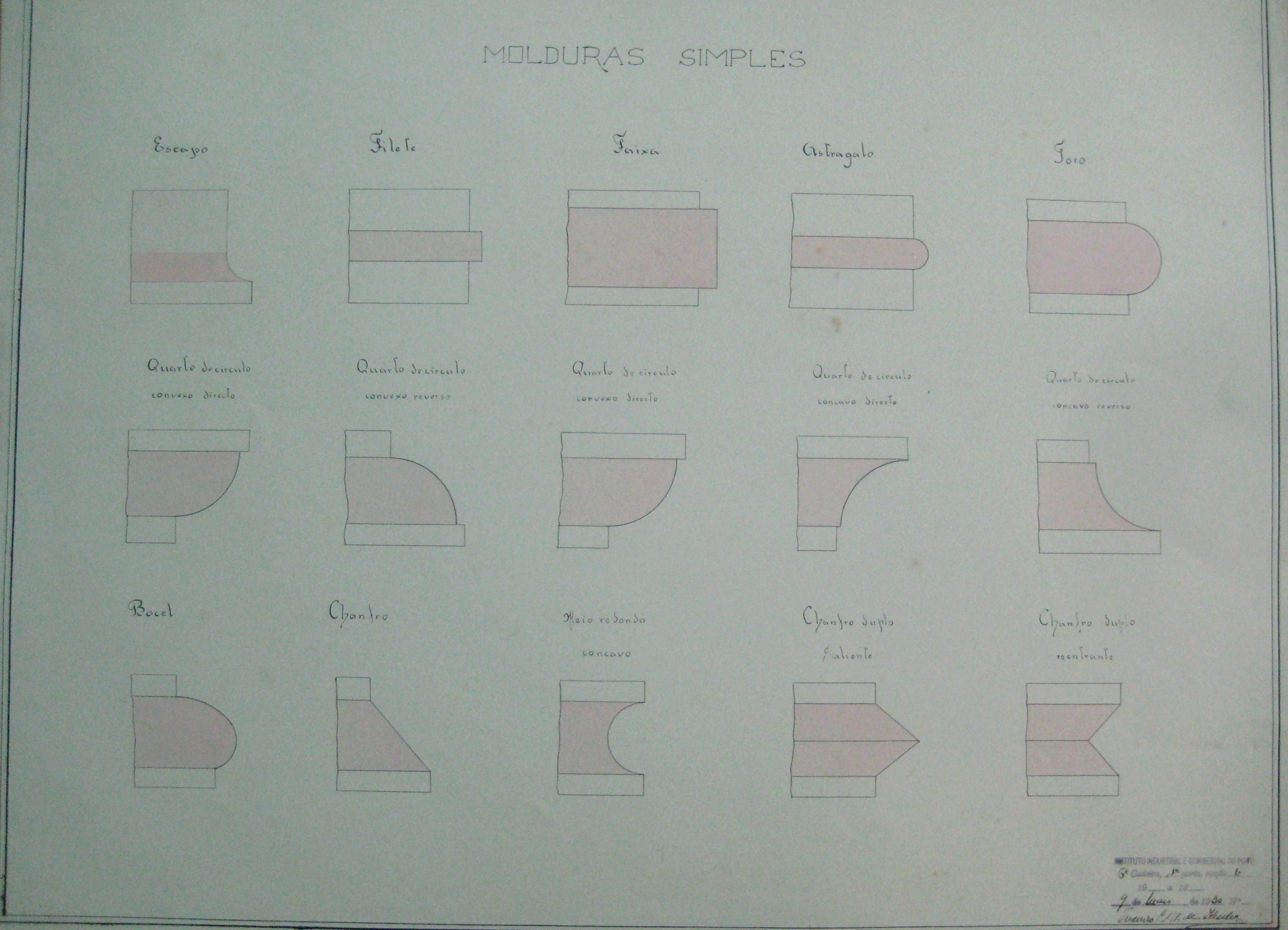 | Descrição: | O trabalho curricular apresenta quinze desenhos de molduras simples. Estão designadas por: "Escapo; Filete; Faixa; Astragalo; Toro; Quarto de círculo Convexo Directo; Quarto de Círculo Convexo Reverso; Quarto de Círculo Convexo Directo; Quarto de Círculo Côncavo Directo; Quarto de Círculo Côncavo Reverso; Bocel; Chanfro; Meio Redondo Concavo; Chanfro Duplo Saliente; Chanfro Duplo Reentrante;" |