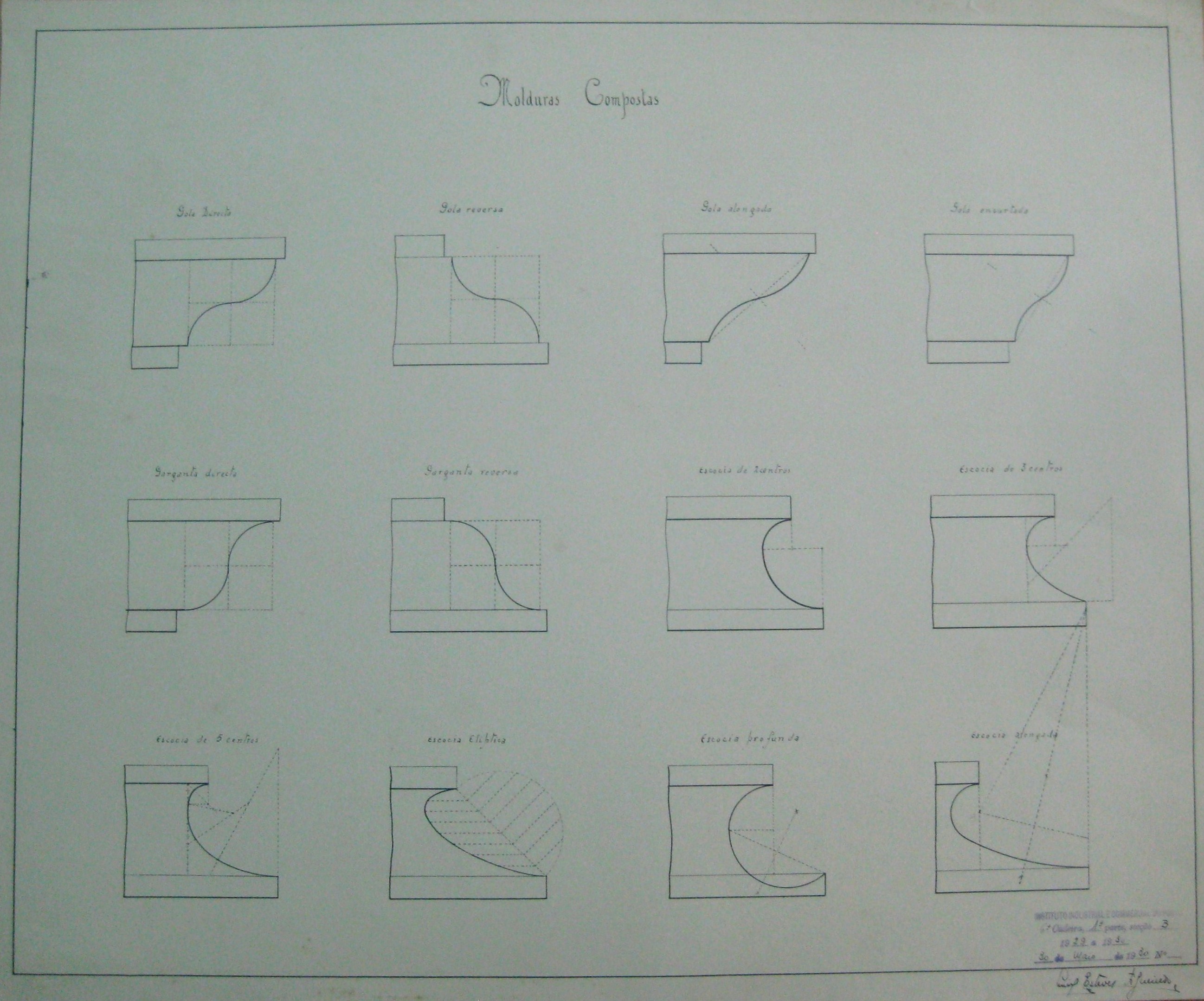 | Descrição: | O trabalho curricular apresenta doze desenhos de molduras compostas. Estas, estão designadas por: "Gola Directa; Gola Reversa; Gola Alongada; Gola Encurtada; Garganta Directa; Garganta Reversa; Escócia de 2 centros; Escócia de 3 centros; Escócia de 5 centros; Escócia Eliptica; Escócia Profunda; Escócia Alongada." |