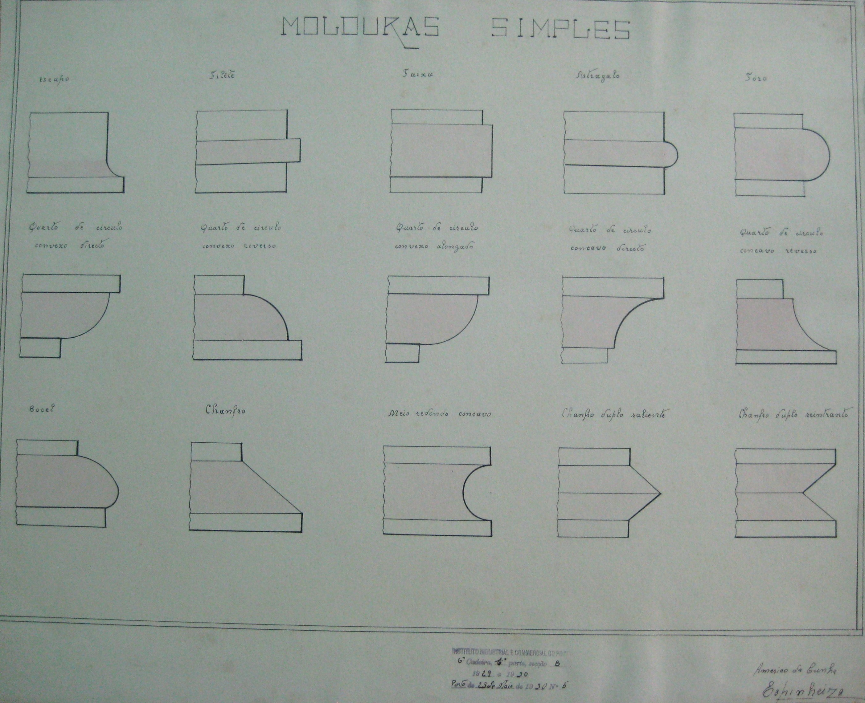 | Observações: | O trabalho possui o carimbo do Instituto Industrial e Comercial do Porto (vigorou 1886 a 1918 e de 1924 a 1933). O carimbo tem a seguinte descrição:"6ª cadeira, 1ª parte, secção b. 1929 a 1930; Porto, 23 de Maio de 1930, Nº. 5". Assinado por: Américo da Cunha Espinheira A 6ª cadeira, 1ª parte, corresponde a "Desenho Técnico". O aluno matriculou-se a 14 de outubro de 1929, no ano lectivo 1929/30, na classe de ordinário, no 1º ano do curso geral industrial e nas seguintes cadeiras: 1ª à 4ª (1ª parte), 6ª (1ª parte); 20ª (1ª parte), Serralharia e carpintaria (1º ano). |