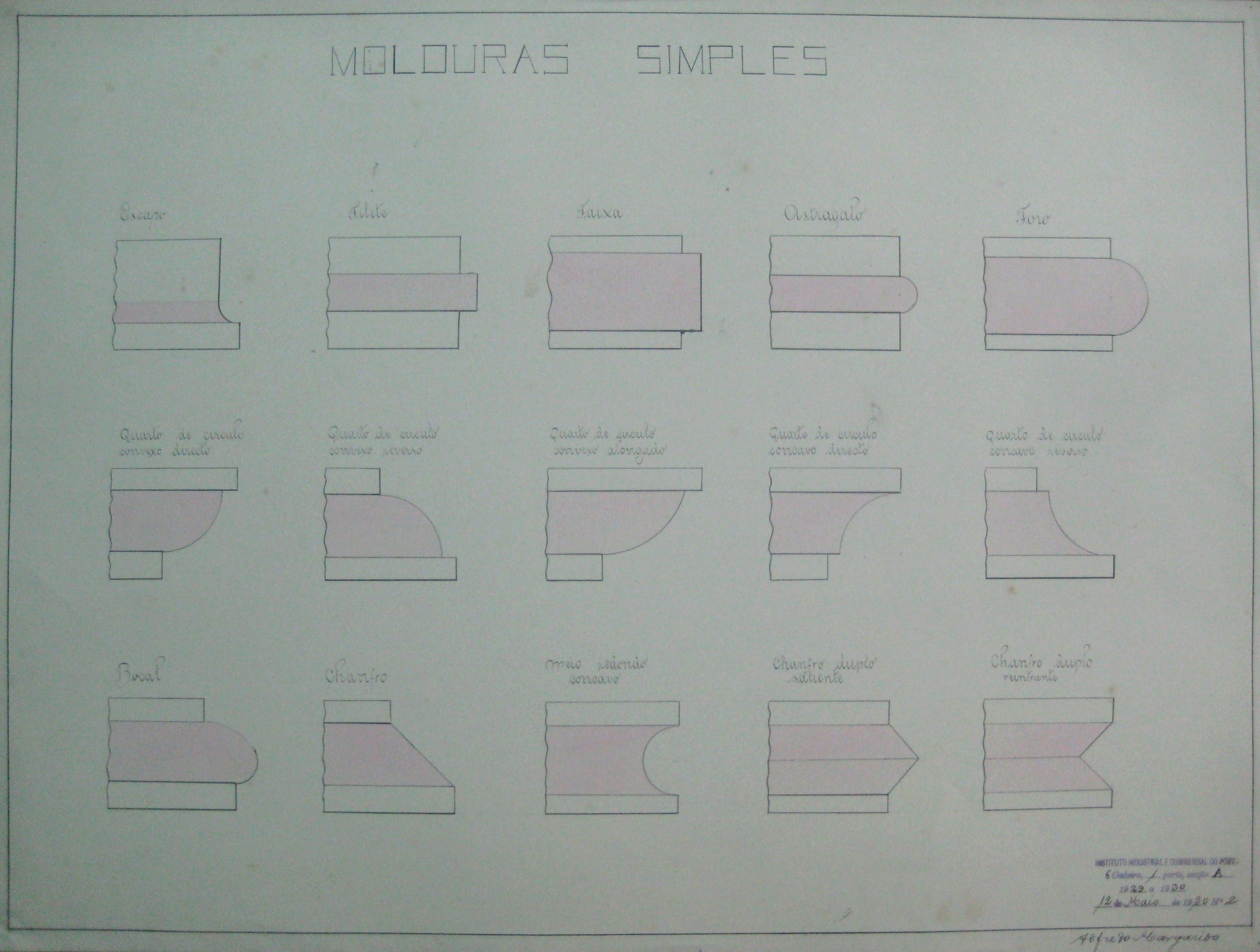 | Descrição: | O trabalho curricular apresenta quinze desenhos de molduras simples. Estes desenhos estão designados por: "Escapo; Filete; Faixa; Astragalo; Toro; Quarto de Círculo Convexo Directo; Quarto de Círculo Convexo Reverso; Quarto de Círculo Convexo Alongado; Quarto de Círculo Côncavo Directo; Quarto de Círculo Côncavo Reverso; Bocel; Chanfro; Meio Redondo Côncavo; Chanfro Duplo Saliente; Chanfro Duplo Reintrante. |