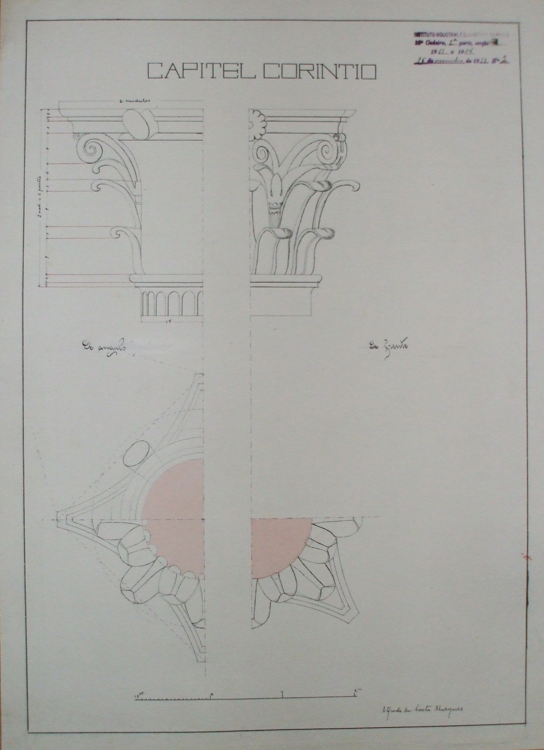 | Observações: | O trabalho possui o carimbo do Instituto Industrial e Comercial do Porto, em vigor entre 1886 a 1918 e de 1924 a 1933. Contém a seguinte descrição: "Instituto Industrial e Commercial do Porto; 22ª Cadeira, 2ª Parte, Secção A; 1913 a 1914; 25 de Novembro de 1913; Nº. 2." A 22ª Cadeira, 2ª Parte, secção A corresponde a "Desenho Arquitectónico (2ºAno)". Assinado por: "Alfredo da Costa Marques" O aluno matriculou-se no dia 17 de outubro de 1913, na classe de voluntário, nas cadeiras de: 9ª (2ªpart); 10ª (2ª prt); 11ª (1ªprt e 2ª prt); 12ª (2ª prt); 14ª (2ª prt); 16ª (2ª prt); 20ª (1ª prt); 21ª (3ª prt); 22ª ( 2ª Prt. A); 22ª (3 prt. B) para seguir o curso superior industrial. |