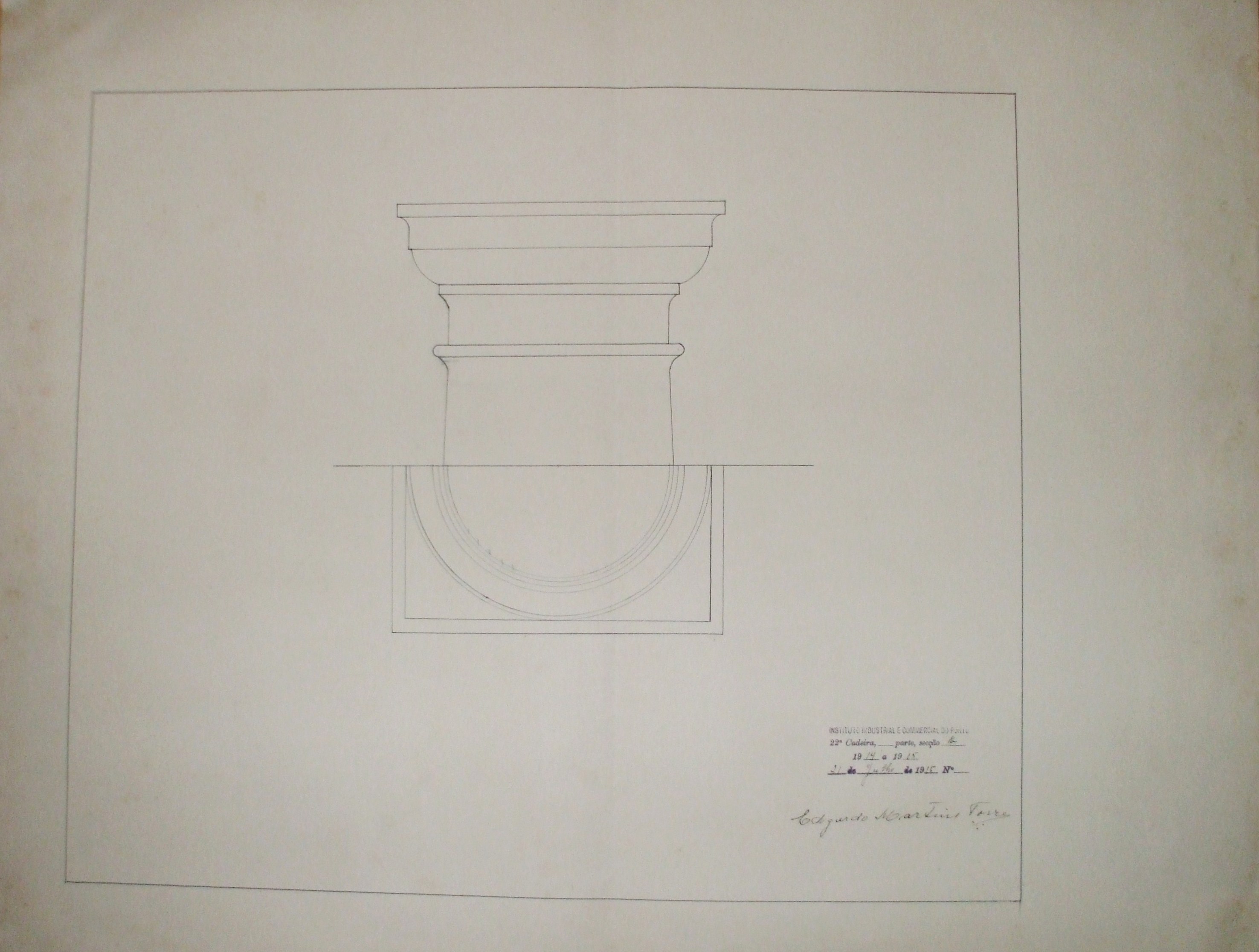 | Observações: | O trabalho curricular possui o carimbo do Instituto Industrial e Comercial do Porto, em vigor entre 1886 a 1918 e de 1924 a 1933. Contém a seguinte descrição:" 22ª Cadeira, ____parte, Secção B. 1914 a 1915; 21 de Julho de 1915, Nº ____." A 22 ª cadeira, 1ª parte, secção B corresponde a "Desenho Arquitectónico (1º ano)." (De acordo com os registos de matricula, o aluno matriculou-se à 22ª cadeira, 1ª parte, secções A e B). Assinado por: Edgardo Martins Torres. O aluno matriculou-se a 6 de outubro de 1914, na classe de voluntário, nas seguintes cadeiras: 3ª-4ª (1ª prt); 8ª (1ªprt); 21ª (2ªPrt); 22ª (1ªprt.a-b) para seguir o curso de construções civis e obras públicas. |