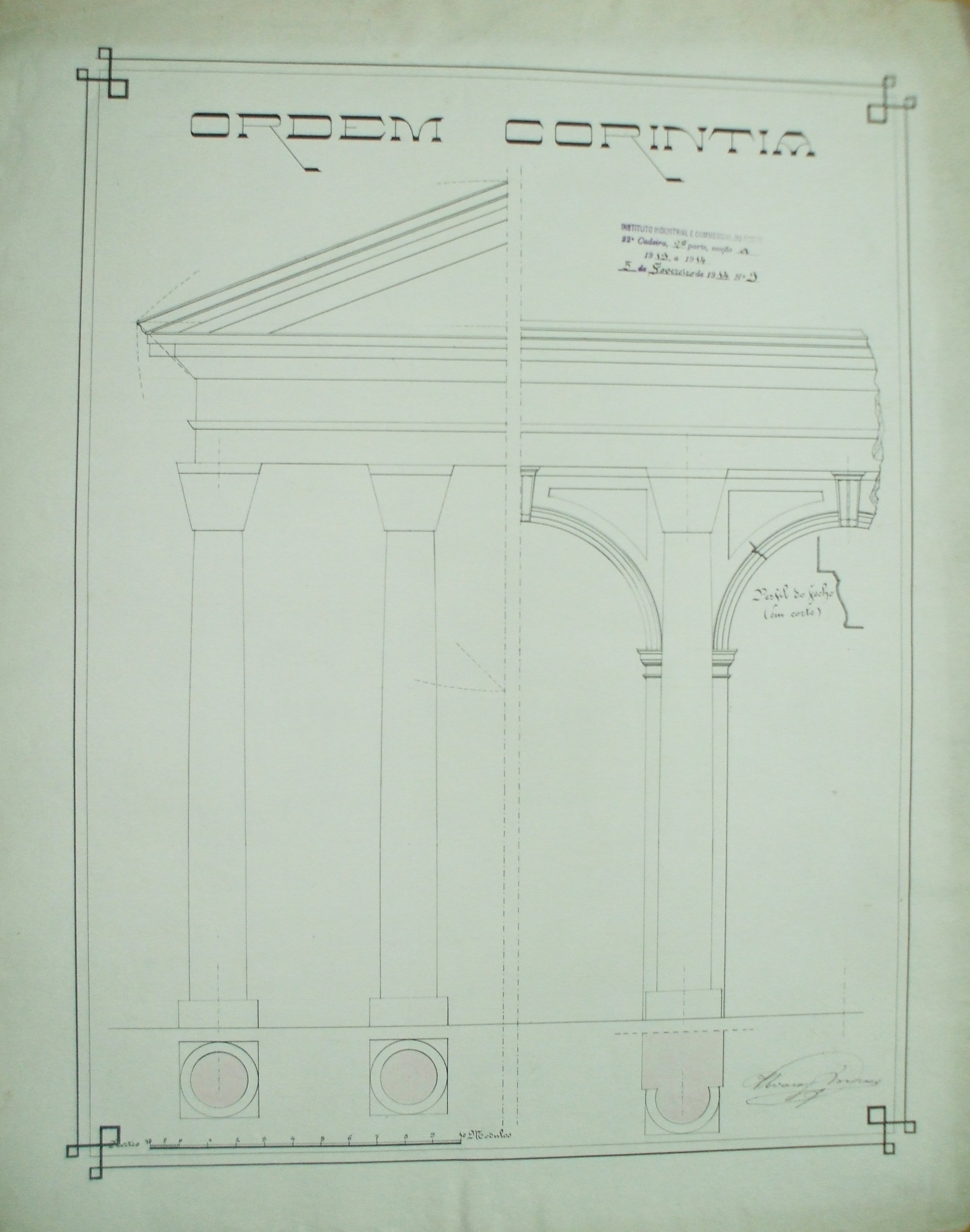 | Observações: | O trabalho curricular possui o carimbo do Instituto Industrial e Comercial do Porto, em vigor entre1886 a 1918 e de 1924 a 1933. Contém a seguinte descrição:"22ª Cadeira, 2ª Parte, Secção A. 1913 a 1914; 5 de Fevereiro de 1914, Nº.9." A 22ª Cadeira, 2ª Parte, secção A corresponde a "Desenho Arquitectónico (2º Ano)". Assinado por: Álvaro Moraes O aluno matriculou-se no dia 10 de outubro de 1913, na classe de voluntário,nas seguintes cadeiras: 2ª-3ª-4ª-7ª (2ªprt); 8ª (1ªprt); 21ª (3ªprt); 22ª (2prt. a-b) e 23ª (2ªprt), para seguir o curso de construções civis e obras públicas. |