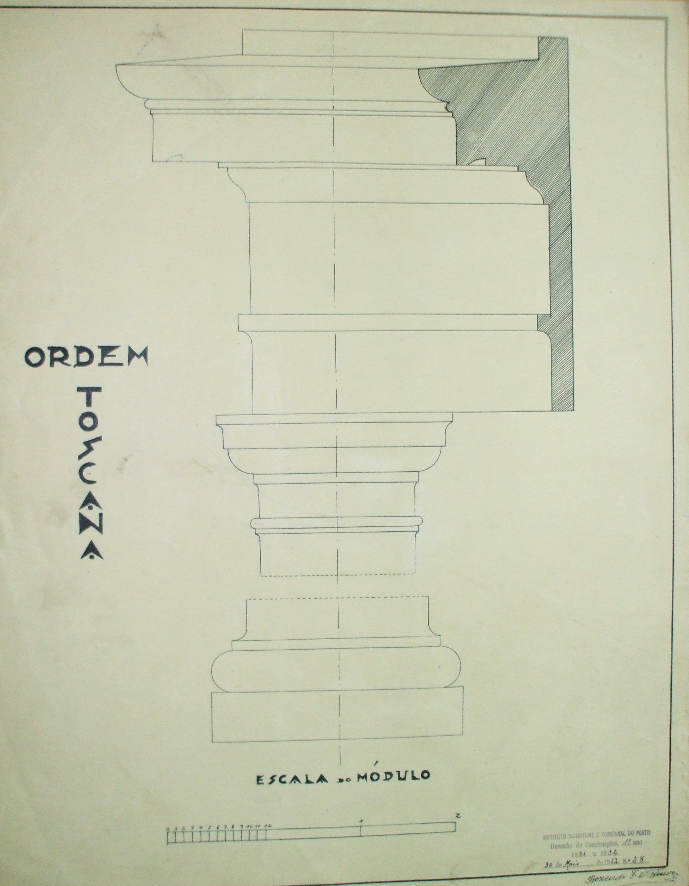 | Observações: | O trabalho curricular possui o carimbo do Instituto Industrial e Comercial do Porto, que vigorou de 1886 a 1918 e de 1924 a 1933. Contém a seguinte descrição: "Instituto Industrial e Commercial do Porto. Desenho de Construções, 1º ano. 1931 a 1932. 30 de Maio de 1932, Nº. 28". Assinado por: Rozendo F.O.Ruivo O aluno matriculou-se no dia 3 de novembro de 1931, no curso preparatório para a faculdade de ciências (1º ano), na classe de ordinário e nas seguintes cadeiras: 1ª Matemática, 2ª Física, 6ª Mineralogia; 4ª Quimica; Desenho de Construções (1º ano). O desenho contém a escala do Módulo. |
