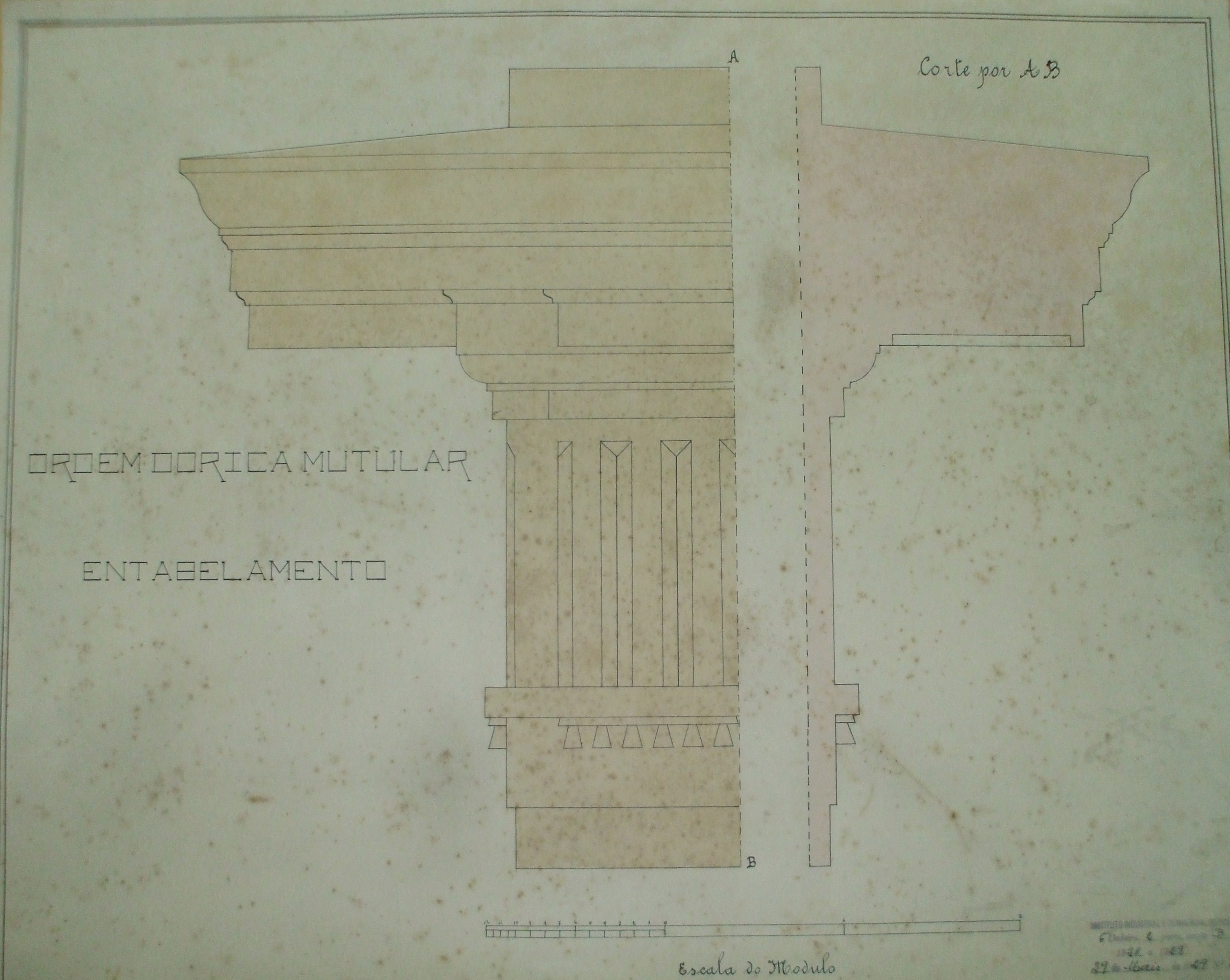 | Descrição: | O trabalho curricular contém dois desenhos que representam o desenho dum entablamento da ordem dórica mutular e o corte da secção AB. Em baixo dos desenhos, existe a escala do módulo. A ordem dórica mutular é uma variante da ordem dórica, caracterizada pela existência de mútulos sob a cornija do entablamento. Os mútulos são modilhões, ornamento com a forma dum bloco de secção quadrado saliente. Usado em série corresponde a cada triglifo e a cada métapo do entablamento. |