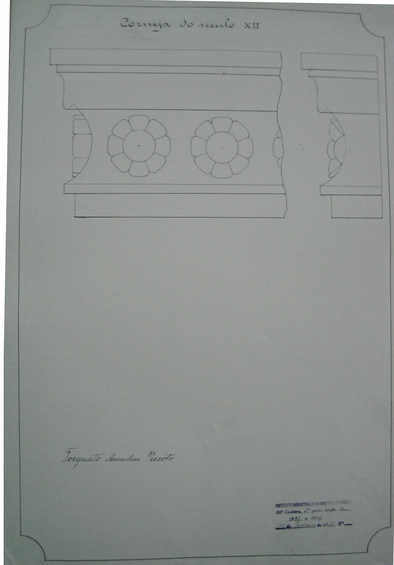 | Observações: | O trabalho curricular possui o carimbo do Instituto Industrial e Comercial do Porto, que vigorou de 1886 a 1918 e de 1924 a 1933. O carimbo contém a seguinte descrição: "Instituto Industrial e Commercial do Porto. 22ª Cadeira, 2ª parte, secção A. 1913 a 1914. 14 de Fevereiro de 1914, Nº.____ " A 22ª cadeira, 2ª parte, secção A corresponde a "Desenho Arquitectónico- (2º ano)". O aluno matriculou-se a 22 de outubro de 1913, ano letivo 1913/14, na classe de ordinário, nas seguintes cadeiras: 4ª (1ªprt); 8ª (1ªprt.); 9ª (1ªprt); 10ª (1ª prt); 21ª (3ª prt) e 22ª (2ª prt. a-b) para seguir o curso de construções civis e obras públicas. |