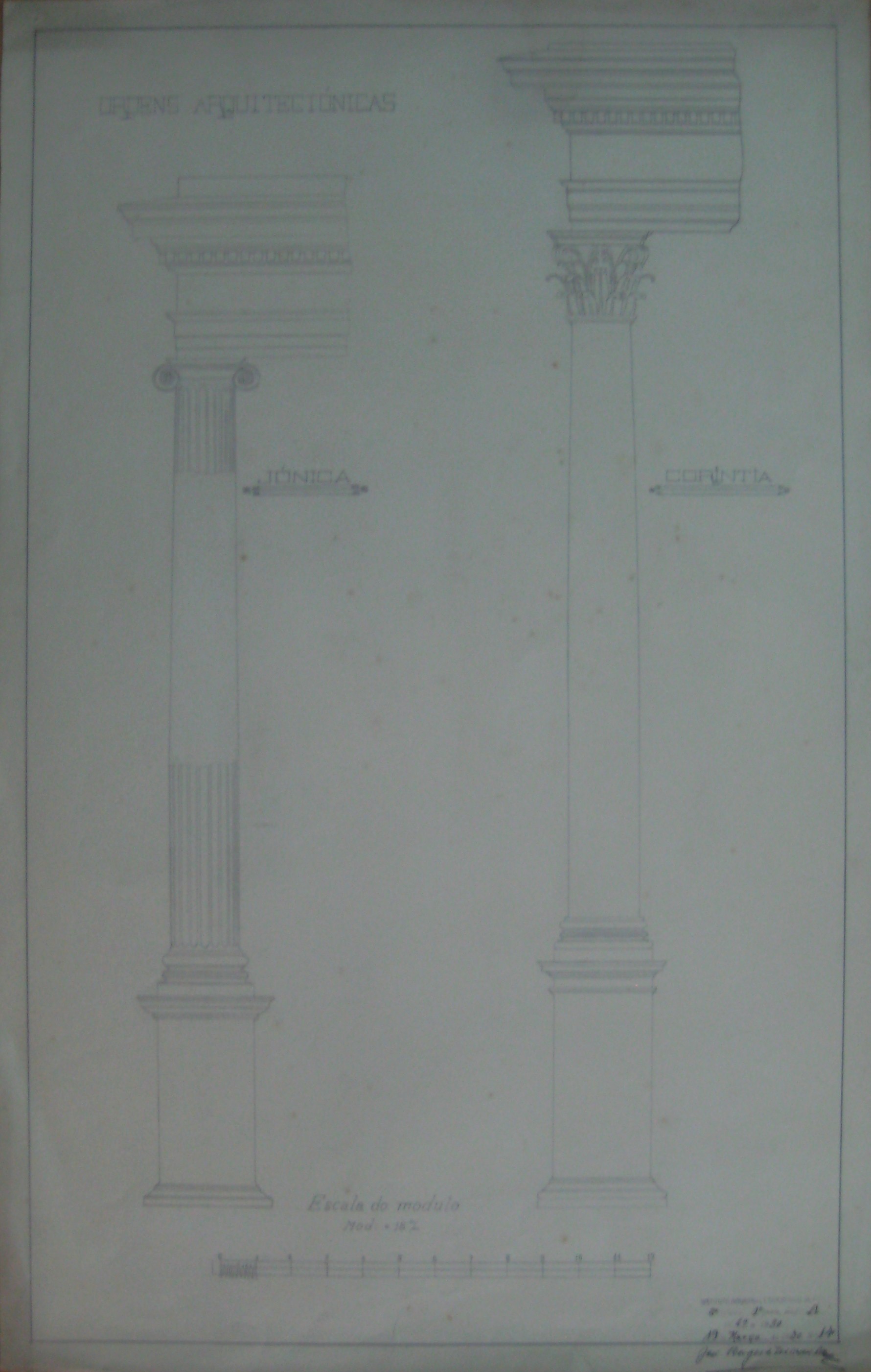 | Observações: | O trabalho curricular possui o carimbo do Instituto Industrial e Comercial do Porto, que vigorou de 1886 a 1918 e de 1924 a 1933. O carimbo contém a seguinte descrição:"Instituto Industrial e Comercial do Porto. 6ª Cadeira, 1ª Parte, Secção A. 1929 a 1930; 19 de Março de 1930, Nº. 24". Assinado pelo aluno. A 6ª cadeira, 1ª parte, Secção A corresponde a "Desenho Técnico". O trabalho contém a escala do Módulo. Cada módulo equivale a 18m/m. O aluno matriculou-se no dia 11 de outubro de 1929, ano letivo de 1929/30, na classe de voluntário, no curso geral industrial (1º e 2º anos) e nas cadeiras: 1ª (1ª prt); 2ª (1ª prt); 4ª (2ª prt); 6ª (2ª prt); 21ª(1ª prt); Serralharia (2º ano), Carpintaria (2º ano). |