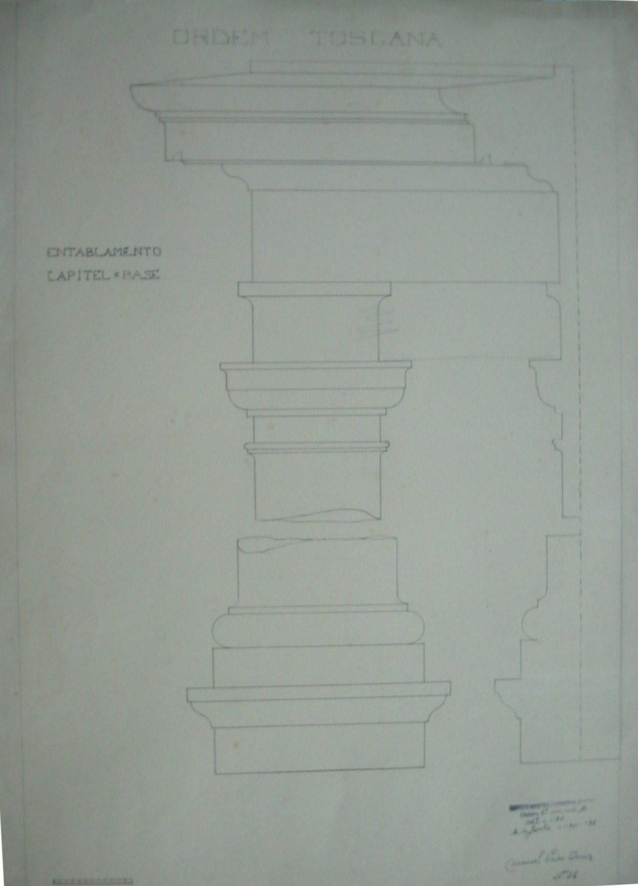 | Descrição: | O desenho representa um fragmento arquitetónico, da ordem toscana, constituido por Base, Capitel e Entablamento. A ordem toscana caracteriza-se pela simplicidade das formas. |