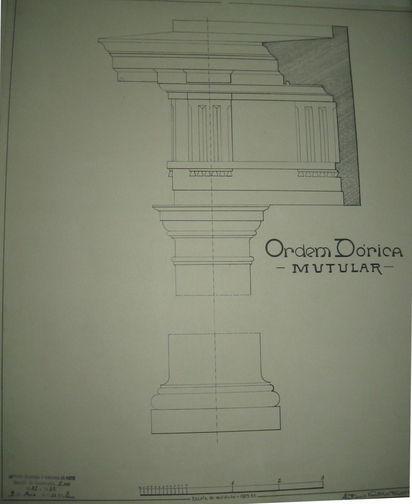 | Observações: | O trabalho curricular contém o carimbo do Instituto Industrial e Comercial do Porto, que vigorou entre 1886 a 1918 e de 1924 a 1933. Contém a seguinte Descrição: "Instituto Industrial e Comercial do Porto. Desenho de Construções, 1º ano. 1931 a 1932. 9 de Maio de 1932, nº. 8". Assinado por: "António Ventura Teixeira Pinto". O aluno matriculou-se no dia 5 de novembro de 1931, ano letivo 1931/32, na classe de ordinário, no curso preparatório para a faculdade de ciências e nas seguintes cadeiras: 1ª matemática; 2ª Fisica; 6ª Mineralogia; 4ª Quimica; Desenho de Construções (1º ano). |