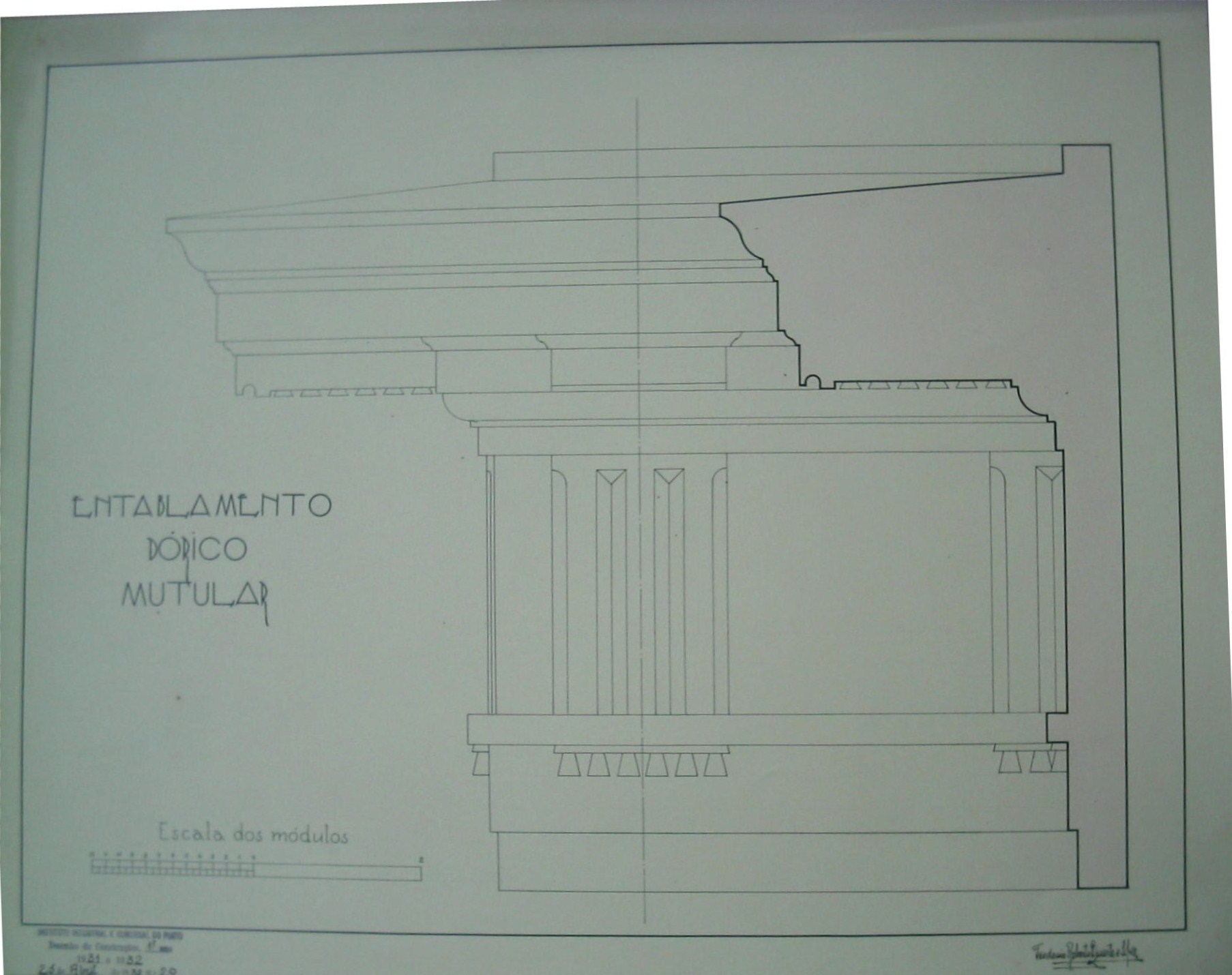 | Descrição: | O trabalho curricular representa um entablamento dórico mutular. A ordem arquitetónica "Dórica Mutular" é uma variante da ordem dórica e caracteriza-se pela existência de mútulos sob a cornija do entablamento. Os mútulos são pequenos ornamentos que possuem a forma dum bloco com a secção quadrada. Usado em série, corresponde a cada triglifo e a cada métopa do entablamento. O trabalho curricular contém o desenho da escala de modulos que representa a escala de 1/12. |