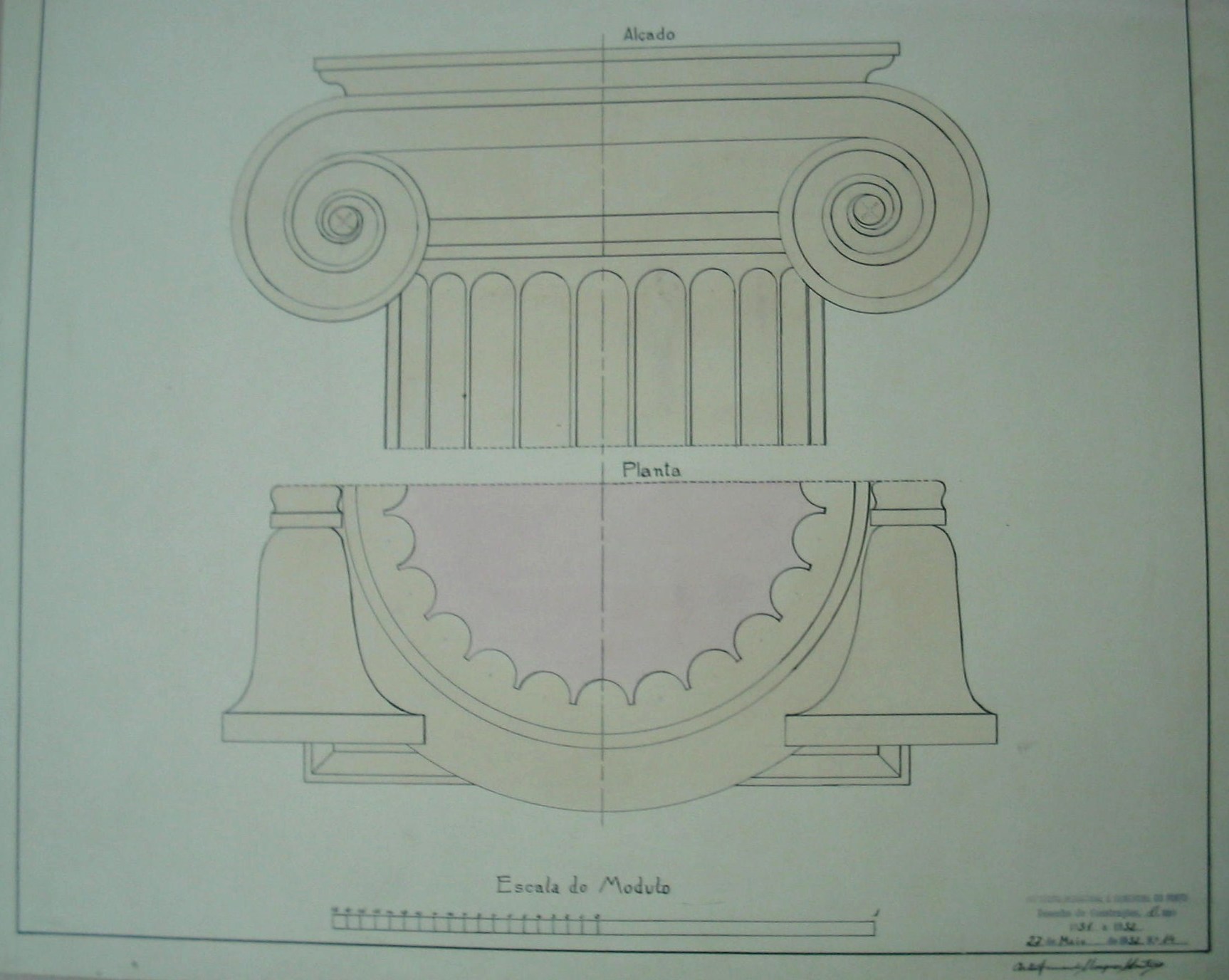 | Observações: | O trabalho curricular possui o carimbo do Instituto Industrial e Comercial do Porto, que vigorou entre 1886 a 1918 e de 1924 a 1933. O carimbo contém a seguinte descrição:"Instituto Industrial e Comercial do Porto. Desenho de Construções, 1º ano. 1931 a 1932. 27 de Maio de 1932, Nº. 14". Assinado pelo aluno: Artur Fernando Marques Monteiro O aluno matriculou-se no dia 3 de Novembro de 1931, ano letivo 1931/32, na classe de ordinário, no 1º ano do curso preparatório para o Instituto Superior Técnico e nas seguintes cadeiras: 1ª -Matemática; 2ª-Física; 6ª-Mineralogia; 4ª-Quimica; Desenho de Construções (1ºano). |