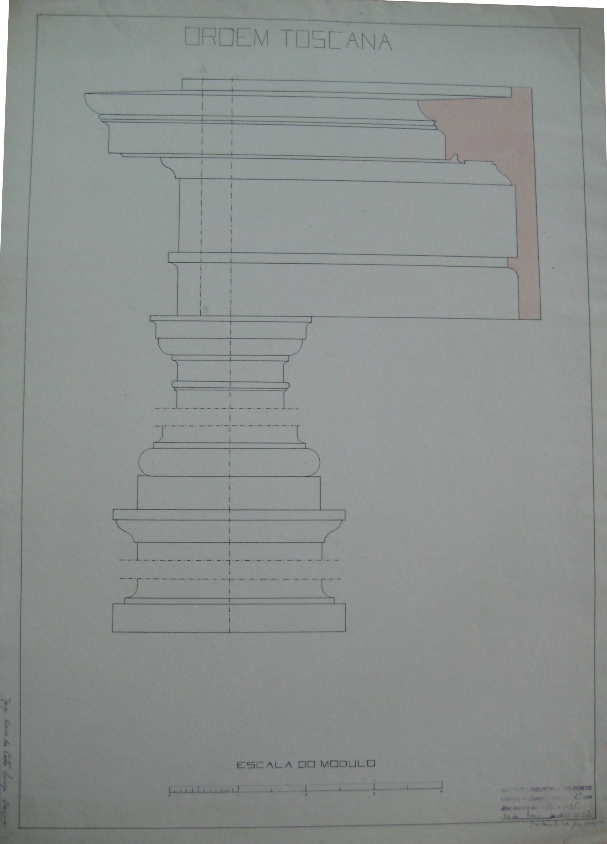 | Observações: | O trabalho possui o carimbo do Instituto Industrial do Porto, que vigorou de 1864 a 1886, de 1918 a 1924 e de 1933 a 1974. O carimbo contém a seguinte descrição:"Instituto Industrial do Porto. Cadeira de Desenho Técnico, 2º ano. Ano Lectivo de 1934 a 1935. 30 de Março de 1935, Nº. 62." O trabalho foi assinado pelo aluno e possui a escala do modulo. |