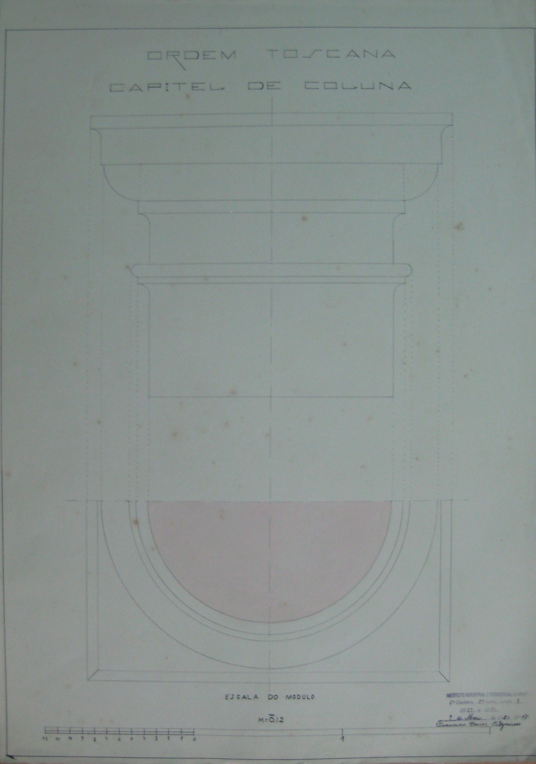 | Observações: | O trabalho curricular possui o carimbo do Instituto Industrial e Commercial do Porto, que vigorou de 1886 a 1918 e de 1924 a 1933. O carimbo contém a seguinte descrição:"Instituto Industrial e Commercial do Porto. 6ª cadeira, 2ª parte, secção B. 1929 a 1930. 9 de Maio de 1930, Nº. 15". No trabalho foi desenhado a escala do modulo. Cada módulo corresponde a 0,12m. O aluno matriculou-se no dia 29 de outubro, ano letivo 1929/30, na classe de ordinário, no curso gerla industrial (1º ano), nas cadeiras: 1ª (1ªprt.); 2ª (1ªprt.); 3ª (1ªprt.); 4ª (1ªprt.); 6ª (1ªprt); 20ª (1ªprt.); Serralharia (1º ano); Carpintaria (1º ano). |