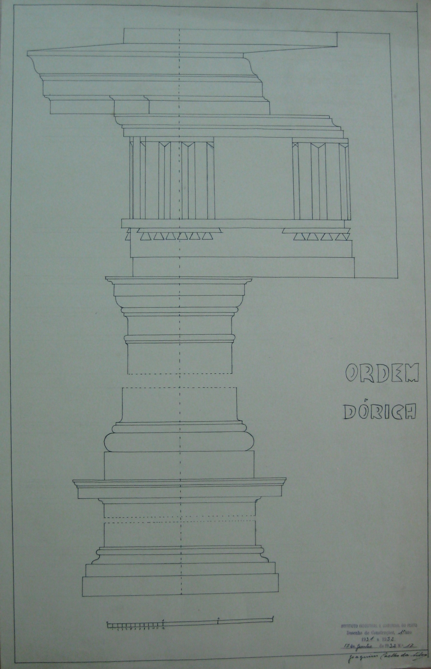 | Observações: | O trabalho curricular possui o carimbo do Instituto Industrial e Comercial do Porto, que vigor de 1886 a 1918 e de 1924 a 1933. O carimbo contém a seguinte descrição: Instituto Industrial e Comercial do Porto. Desenho de Construções, 1º ano. 1931 a 1932. 17 de Junho de 1932, Nº. 17". No trabalho foi desenhado a escala. O aluno matriculou-se no dia 7 de Dezembro de 1931, ano letivo 1931/32, na classe de ordinário, no curso de Construções Civis e Obras Públicas e nas cadeiras: 1ª Matemática (2º ano); 2ª Física (2º ano); 6ª Mineralogia (2º ano); 21ª Tecnologia Mineira; Desenho de Construções (1º ano); Carpintaria (1º ano); |