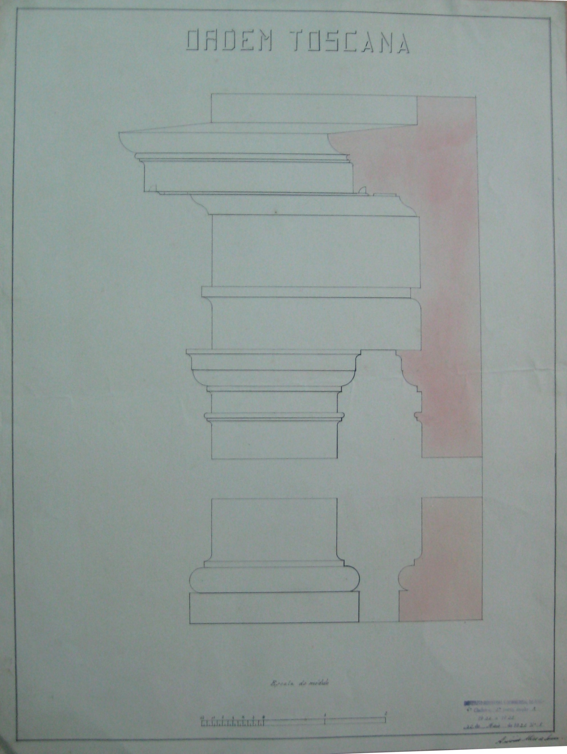 | Observações: | O trabalho possui o carimbo do Instituto Industrial e Comercial do Porto, que vigorou de 1886 a 1918 e de 1924 a 1933. O carimbo contém a seguinte descrição:"Instituto Industrial e Commercial do Porto. 6ª cadeira, 1ª parte; secção A. 1930 a 1931. 30 de Maio de 1931, Nº. 5." A 6ª cadeira, 1ª parte, secção A corresponde a "Desenho Técnico". No trabalho foi desenhada a escala do módulo. O aluno matriculou-se no dia 15 de outubro de 1930, ano letivo 1930/31, na classe de ordinário, no curso geral industrial (1º ano) e nas seguintes cadeiras: 1ª- 1ªprt; 2ª-1ªprt;3ª-1ªprt; 4ª-1ªprt; 6ª-1ªprt; 20ª-1ªprt; Serralharia (1º ano); Carpintaria (1º ano). |