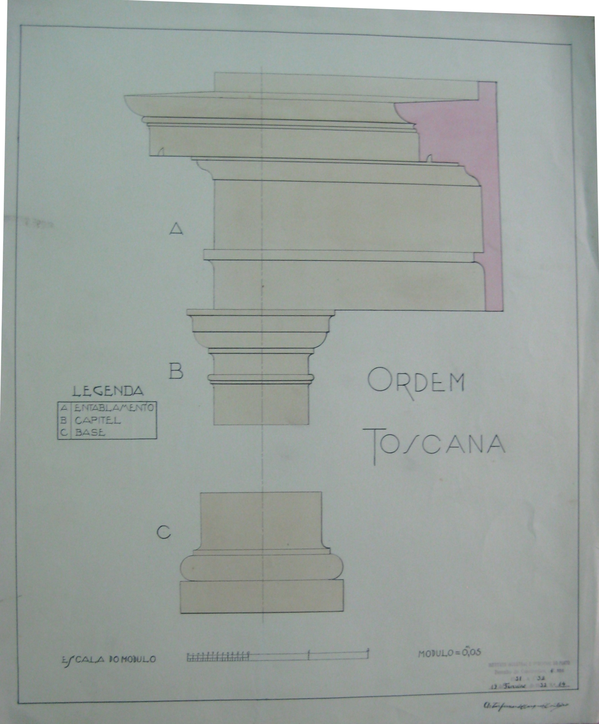 | Observações: | O trabalho possui o carimbo do Instituto Industrial e Comercial do Porto, que vigorou de 1886 a 1918 e de 1924 a 1933. O carimbo tem a seguinte inscrição:"Instituto Industrial e Comercial do Porto. Desenho de Construções, 1º ano. 1931 a 1932. 19 de Fevereiro de 1932, Nº. 14.". Foi desenhado, no trabalho, a escala do Módulo. Cada módulo corresponde a 0,05 m. O aluno matriculou-se no dia 3 de novembro de 1931, ano letivo 1931/32, na classe de ordinário, no curso Prepapratório para o Instituto Superior Técnico (1ºano), nas cadeiras: 1ª Matemática; 2ª Física; 6ª Mineralogia; 4ª Química; Desenho de Construções (1º ano). |