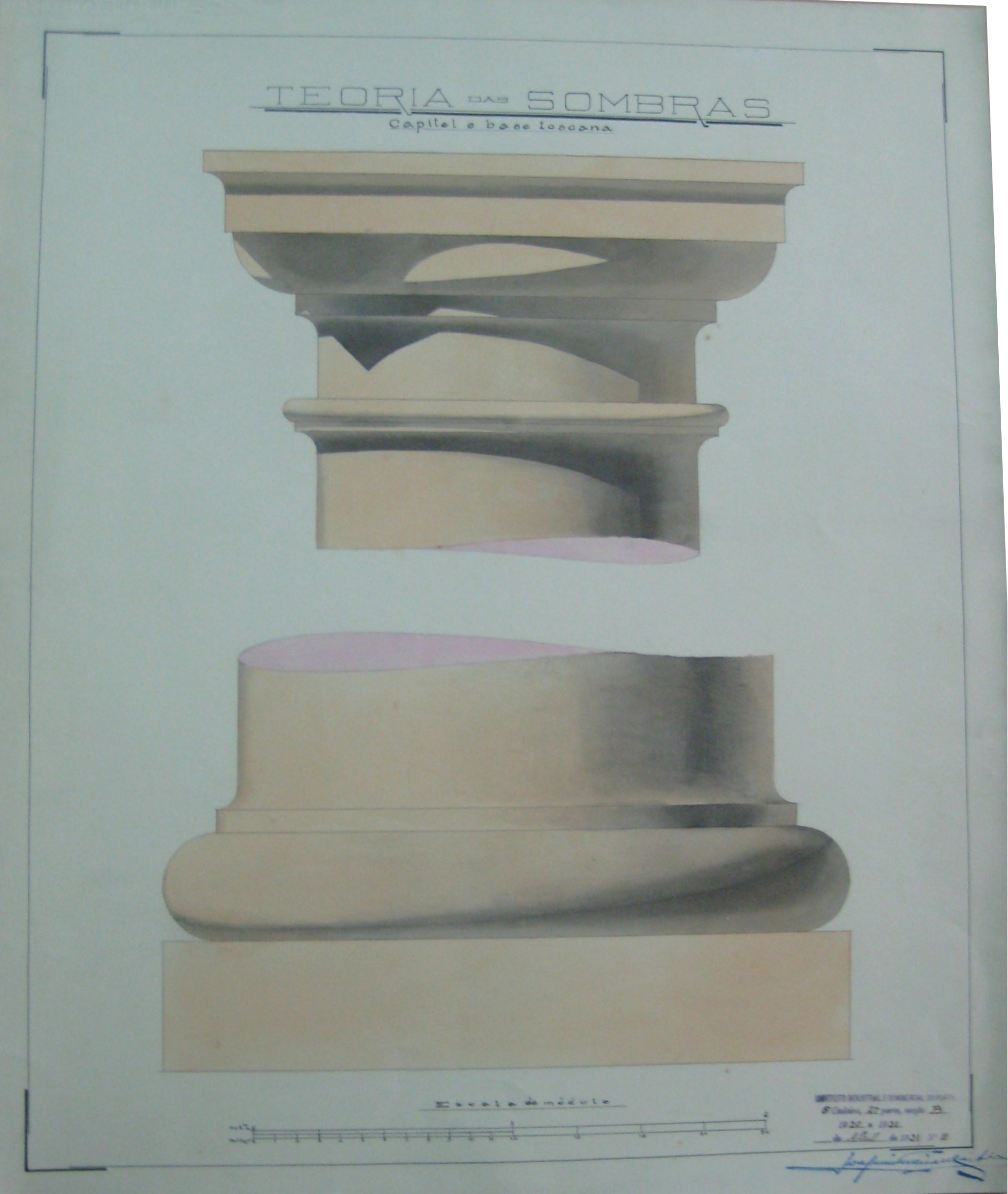 | Observações: | O trabalho possui o carimbo do Instituto Industrial e Comercial do Porto, que vigorou de 1886 a 1918 e de 1924 a 1933. O carimbo contém a seguinte descrição:"Instituto Industrial e Commercial do Porto. 6ª cadeira, 2ªparte, secção B. 1930 a 1931. ___ de Abril de 1931, Nº. 11". A 6ª cadeira, 2ª parte correspondia a "Desenho Técnico". O trabalho contém a escala do módulo. O aluno matriculou-se no dia 30 de outubro de 1930, na classe de voluntário, no curso geral industrial (2º ano) e nas cadeiras: 1ª-1ªprt; 2ª-1ªprt; 3ª-2ªprt; 4ª-2ªprt; 6ª-2ªprt; 20ª-2ªprt; Serralharia (2º ano); Carpintaria (2º ano). |