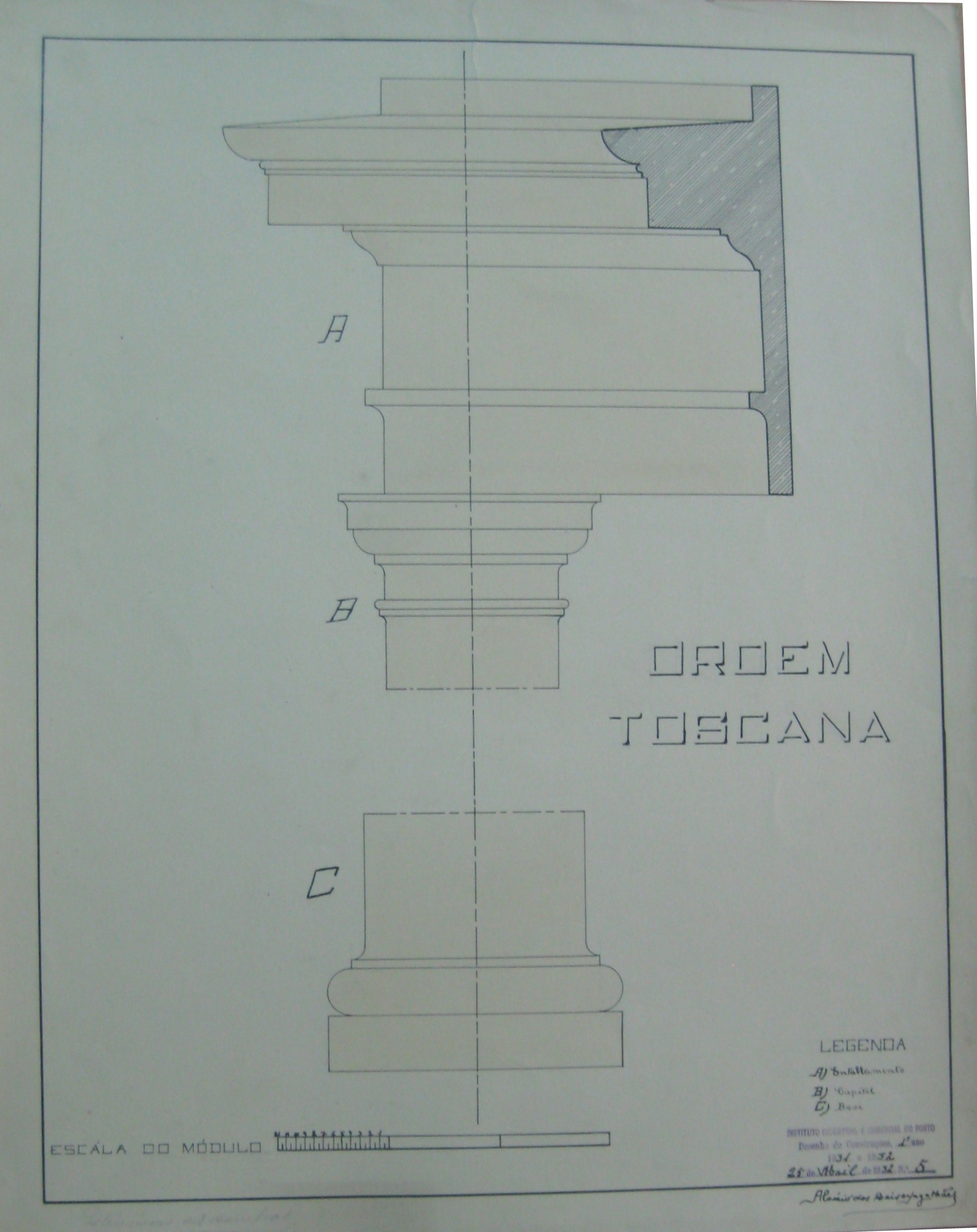 | Observações: | O trabalho possui o carimbo do Instituto Industrial e Comercial do Porto, que vigorou de 1886 a 1918 e de 1924 a 1933. O carimbo contém a seguinte descrição:"Instituto Industrial e Comercial do Porto. Desenho de Construções, 1º ano. 1931 a 1932. 25 de Abril de 1932, Nº. 5". O trabalho tem desenhado a escala do módulo. Possui a seguinte frase escrita, a lápis, no canto inferior esquerdo: "Determinar as sombras" O aluno matriculou-se no dia 4 de novembro de 1931, ano letivo 1931/32, na classe de ordinário, no curso de Construções, Obras Públicas e Minas, nas cadeiras: 1ª Matemática; 2ªFísica; 6ª Mineralogia; 4ª Química; Desenho de Construções; Carpintaria. |