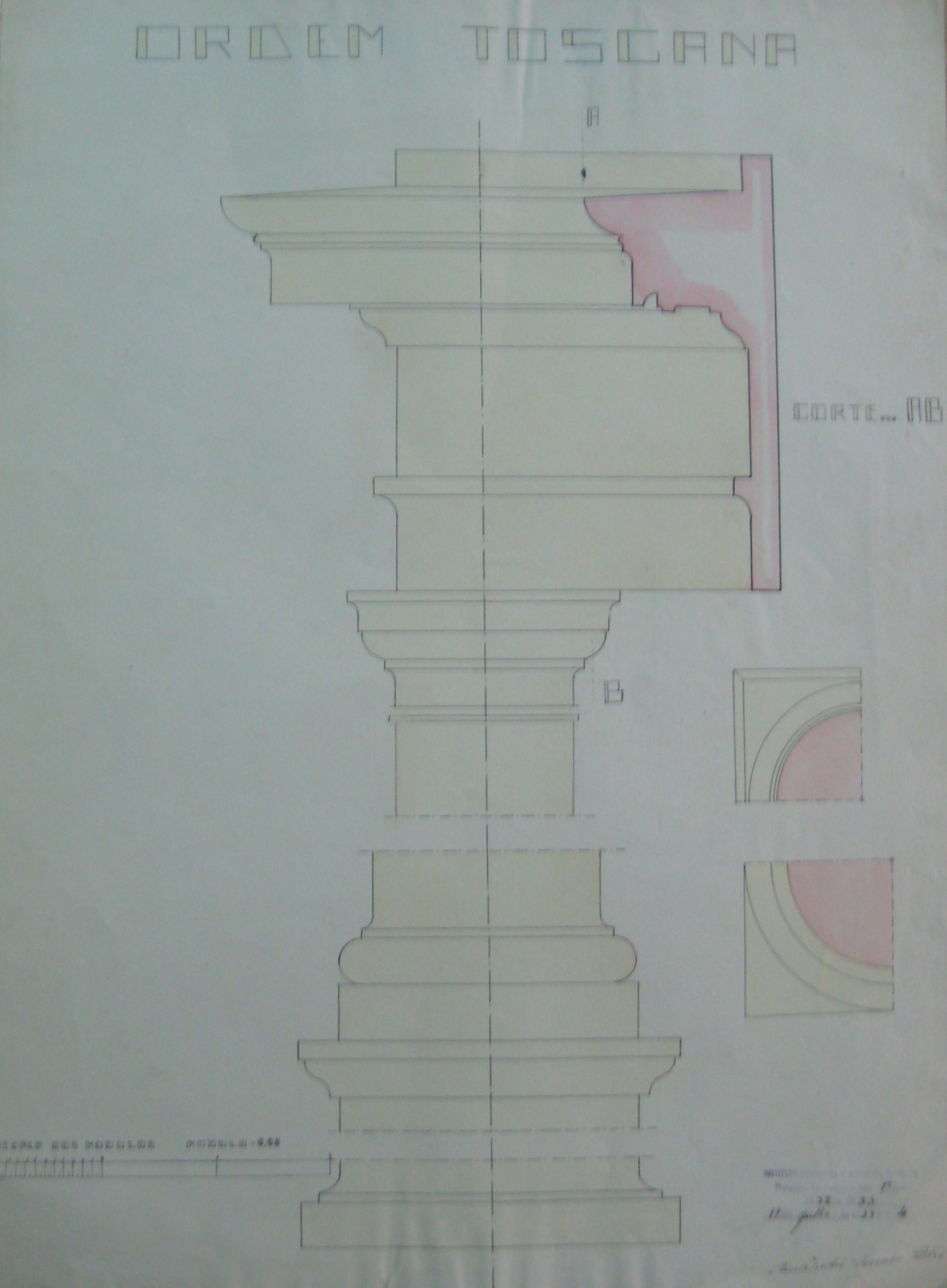 | Observações: | O trabalho possui o carimbo do Instituto Industrial e Comercial do Porto, que vigorou de 1886 a 1918 e de 1924 a 1933. O carimbo contém a seguinte descrição:"Instituto Industrial e Comercial do Porto. Desenho de Construções, 1º ano. 1932 a 1933. 17 de Julho de 1933, Nº. 4". O trabalho possui a escala dos módulos. Cada módulo corresponde a 0,05. O aluno matriculou-se no dia 28 de outubro de 1932, na classe de ordinário, no curso de Construções, Obras Públicas e Minas (1º ano) e nas cadeiras: 1ª Matemática; 2ª Física; Laboratório de Física; 4ª Química; Laboratório de Química; 6ª Mineralogia; Laboratório de Mineralogia; Desenho de Constuções; Carpintaria geral 1º ano |