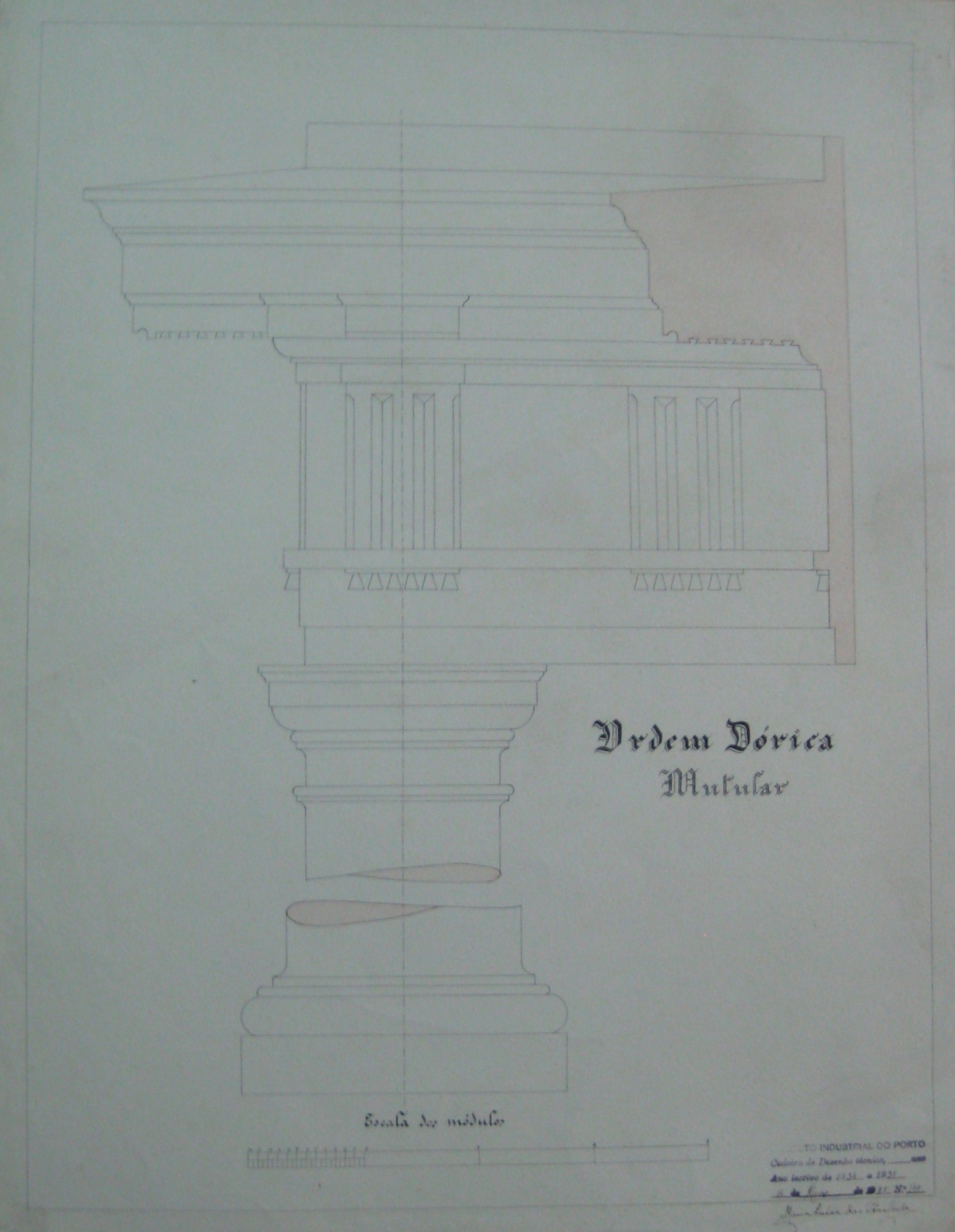 | Observações: | O trabalho possui o carimbo do Instituto Industrial do Porto, que vigorou de 1864 a 1886, de 1918 a 1924 e de 1933 a 1974. O carimbo contém a seguinte descrição: "Instituto Industrial do Porto. cadeira de Desenho Técnico, ____ ano. Ano lectivo de 1934 a 1935. 16 de Março de 1935, Nº. 140." No trabalho foi desenhado a escala do módulo. |
