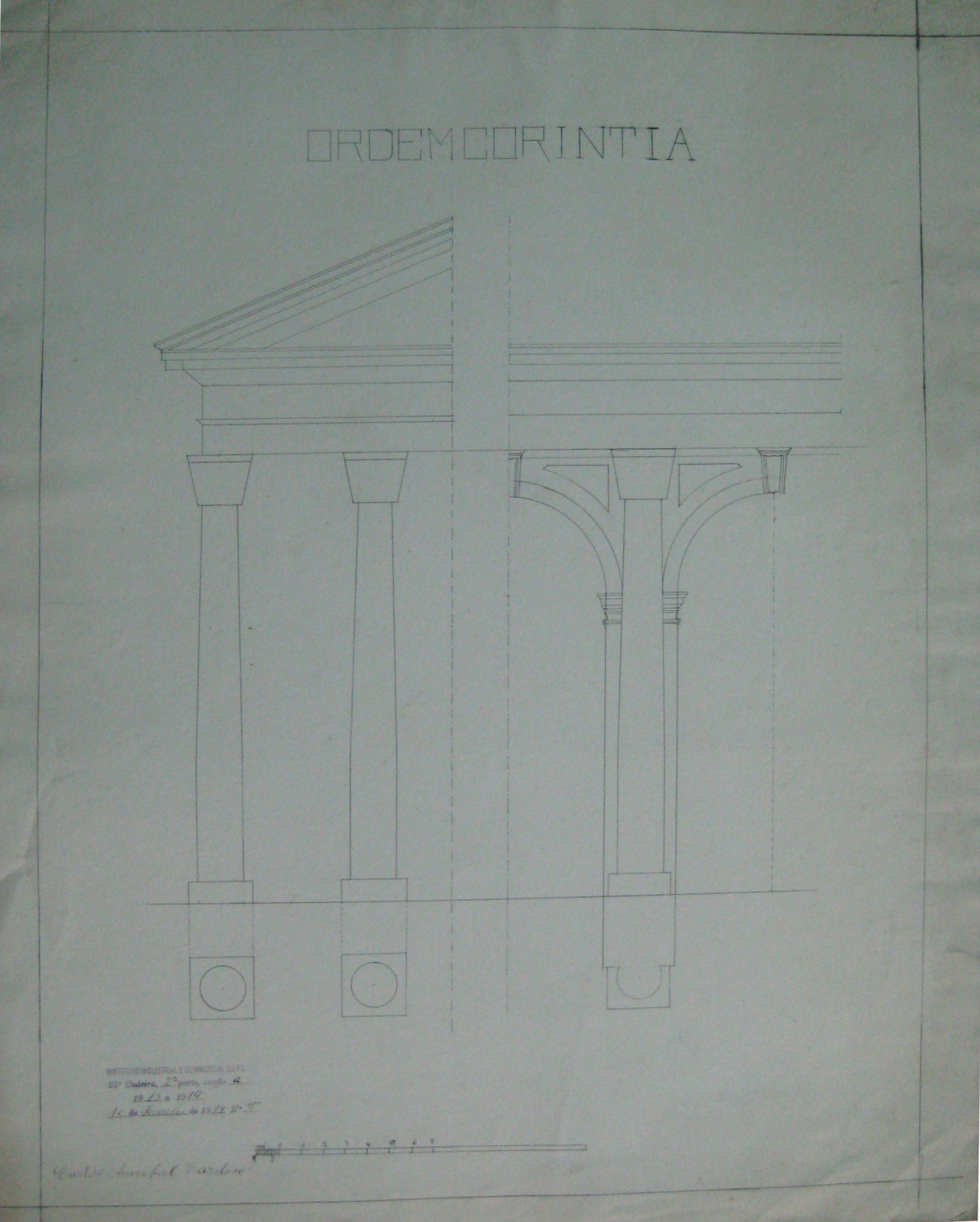 | Observações: | O trabalho possui o carimbo do Instituto Industrial e Comercial do Porto, que vigorou de 1886 a 1918 e de 1924 a 1933. O carimbo contém a seguinte descrição:"Instituto Industrial e Commercial do Porto. 22ª Cadeira, 2ª parte, secção a. 1913 a 1914. 10 de Fevereiro de 1914, Nº.5". A 22ª cadeira, 2ª parte, secção a corresponde a "Desenho Arquitetónico (2º ano)". No trabalho foi desenhado a escala dos módulos. O aluno matriculou-se no ano letivo de 1913/14, no dia 1 de Outubro de 1913, na classe de voluntário nas cadeiras 1ª-7 (3ªprt); 16ª (1ª prt); 21ª (3ªprt); 22ª (2ª Prt. a-b), para seguir os cursos de construções civis e obras públicas e o secundário do comércio. |
