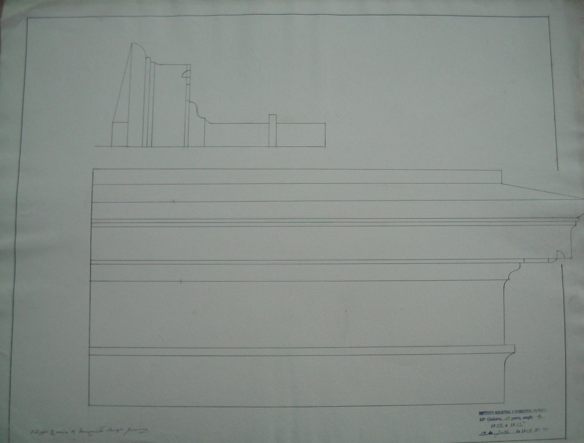 | Observações: | O trabalho curricular possui o carimbo do Instituto Industrial e Comercial do Porto, que vigorou de 1886 a 1918 e de 1924 a 1933. O carimbo contém a seguinte descrição:"Instituto Industrial e Commercial do Porto. 22ª cadeira, 1ª parte, secção b. 1914 a 1915. 22 de Julho de 1915, N.10". A 22ª cadeira, 1ª parte, secção b corresponde a "Desenho arquitectónico (1º ano)". O aluno matriculou-se no dia 12 de outubro de 1914/15, na classe de voluntário, nas cadeiras 2ª; 3ª 4ª (1ª prt); 8ª (1ª prt); 21ª (2ª prt); 22ª (1ª prt. a-b) e 23ª (2ª prt), para seguir o curso de construções civis e obras públicas. |