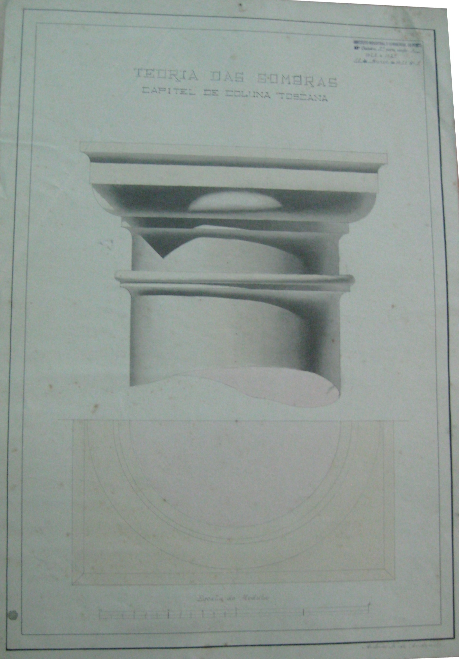 | Observações: | O trabalho possui o carimbo do Instituto Industrial e Comercial do Porto, que vigorou de 1886 a 1918 e de 1924 a 1933. O carimbo contém a seguinte descrição:"Instituto Industrial e Commercial do Porto. 6ª cadeira, 2ª parte, secção A. 1928 a 1929. 18 de Março de 1929, Nº.1". A 6ª cadeira, 2ª parte, secção A corresponde a "Desenho Técnico". No trabalho foi desenhado a escala do Módulo. O aluno matriculou-se no dia 23 de outubro de 1928, ano letivo 1928/29, na classe de voluntário, no curso geral industrial (1º e 2º anos), nas cadeiras 1ª (2ª prt); 2ª (1ª prt. e 2ª prt); 5ª (1ª prt); 6ª (2ª prt); 14ª (2ª prt); 20ª (2ª prt). |