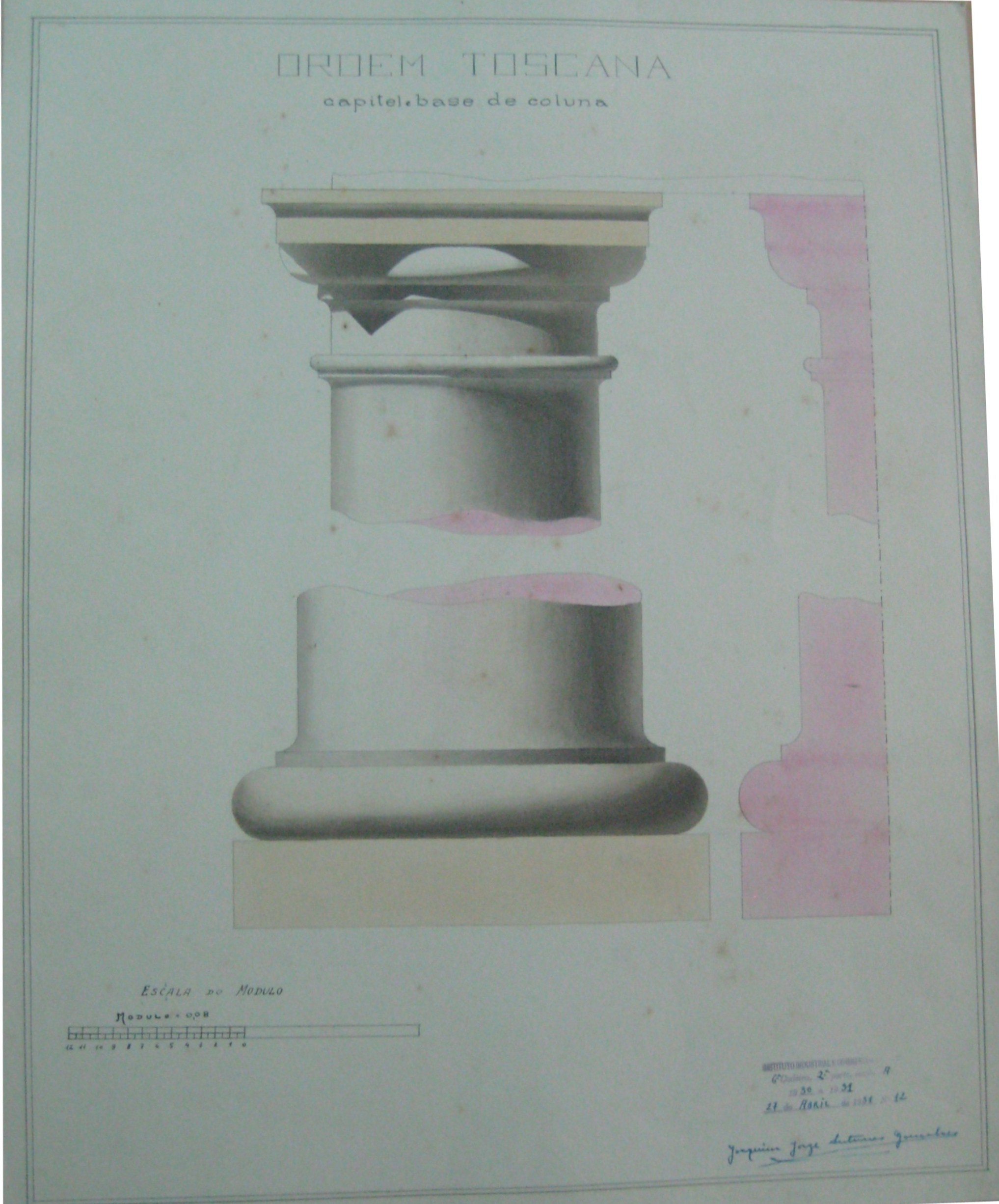 | Observações: | O trabalho possui o carimbo do Instituto Industrial e Comercial do Porto, que vigorou de 1886 a 1918 e de 1924 a 1933. O carimbo contém a seguinte descrição:"Instituto Industrial e Comercial do Porto. 6ª Cadeira, 2ª parte, secção A. 1930 a 1931. 27 de Abril de 1931, Nº. 12". A 6ª cadeira, 2ª parte, secção A corresponde a " Desenho Técnico". No trabalho foi desenhado a escala do módulo. Cada módulo é = a 0,08. O aluno matriculou-se no dia 17 de outubro de 1930, ano letivo 1930/31, na classe de ordinário, no curso geral industrial (2º ano) e nas seguintes cadeiras: 1ª-2ªprt; 2ª-2ªprt; 3ª-2ªprt; 4ª-2ªprt; 5ª-1prt; 6ª-2ªprt; 20ª-2ªprt; Serralharia (2ºano), Carpintaria (2º ano). |