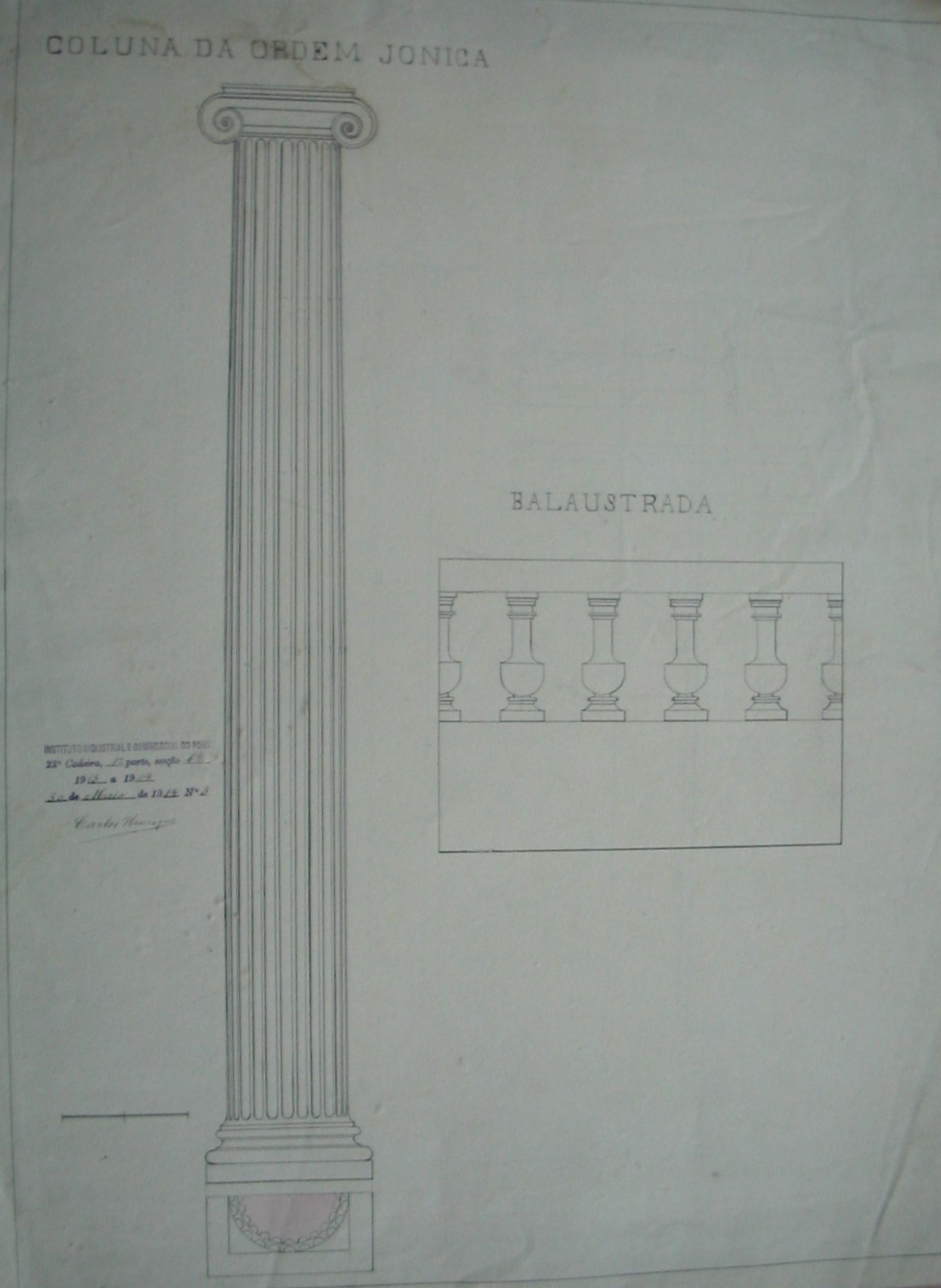 | Observações: | O trabalho curricular possui o carimbo do Instituto Industrial e Comercial do Porto, que vigorou de 1886 a 1918 e de 1924 a 1933. O carimbo contém a seguinte informação:"Instituto Industrial e Commercial do Porto. 22ª cadeira, 1ª parte, secção b. 1913 a 1914. 30 de Maio de 1914, Nº.3". A 22ª cadeira, 1ªparte, secção b correspondia a "Desenho Arquitectónico (1º ano)" de acordo com o Art. 2º do Decreto de 3 de Novembro de 1905. O aluno matriculou-se no ano letivo de 1913/14, no dia 13 de outubro de 1913, na classe de voluntário, nas seguintes cadeiras: 8ª (2ª prt); 11ª (1ªprt); 13ª (1ª prt); 14ª (2ª prt); 15ª (3ª prt); 17ª (2ª prt); 18ª (2ª prt); 19ª (2ªprt); 20ª (2ª prt) e 22ª (1ª prt. a-b) para seguir o curso superior industrial e superior do comércio. |