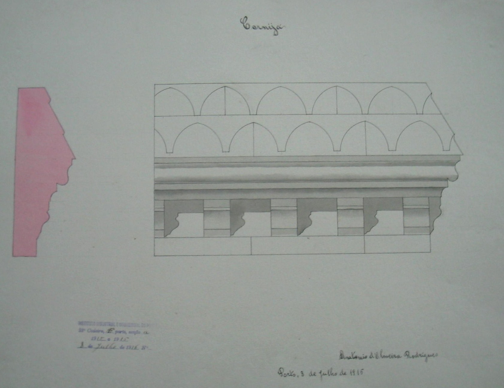 | Observações: | O trabalho possui o carimbo do Instituto Industrial e Comercial do Porto, que vigorou de 1886 a 1918 e de 1924 a 1933. O carimbo contém a seguinte informação: "Instituto Industrial e Commercial do Porto. 22ª cadeira, 1ª parte, secção a. 1915 a 1916. 8 de Julho de 1916, Nº. ___ ". A 22ª cadeira, 1º parte, secção a corresponde a "Desenho Arquitectónico (1º ano)", de acordo com o Decreto de 3 de Novembro de 1905. O aluno matriculou-se no ano letivo de 1915/16, no dia 16 de outubro de 1915, na classe de voluntário, nas cadeiras: 5ª (2ª prt); 16ª (2ªprt); 21ª (3ªprt); 22ª (2ª prt. a-b) e 23ª (2ª prt), para o curso de construções civis e obras públicas. |