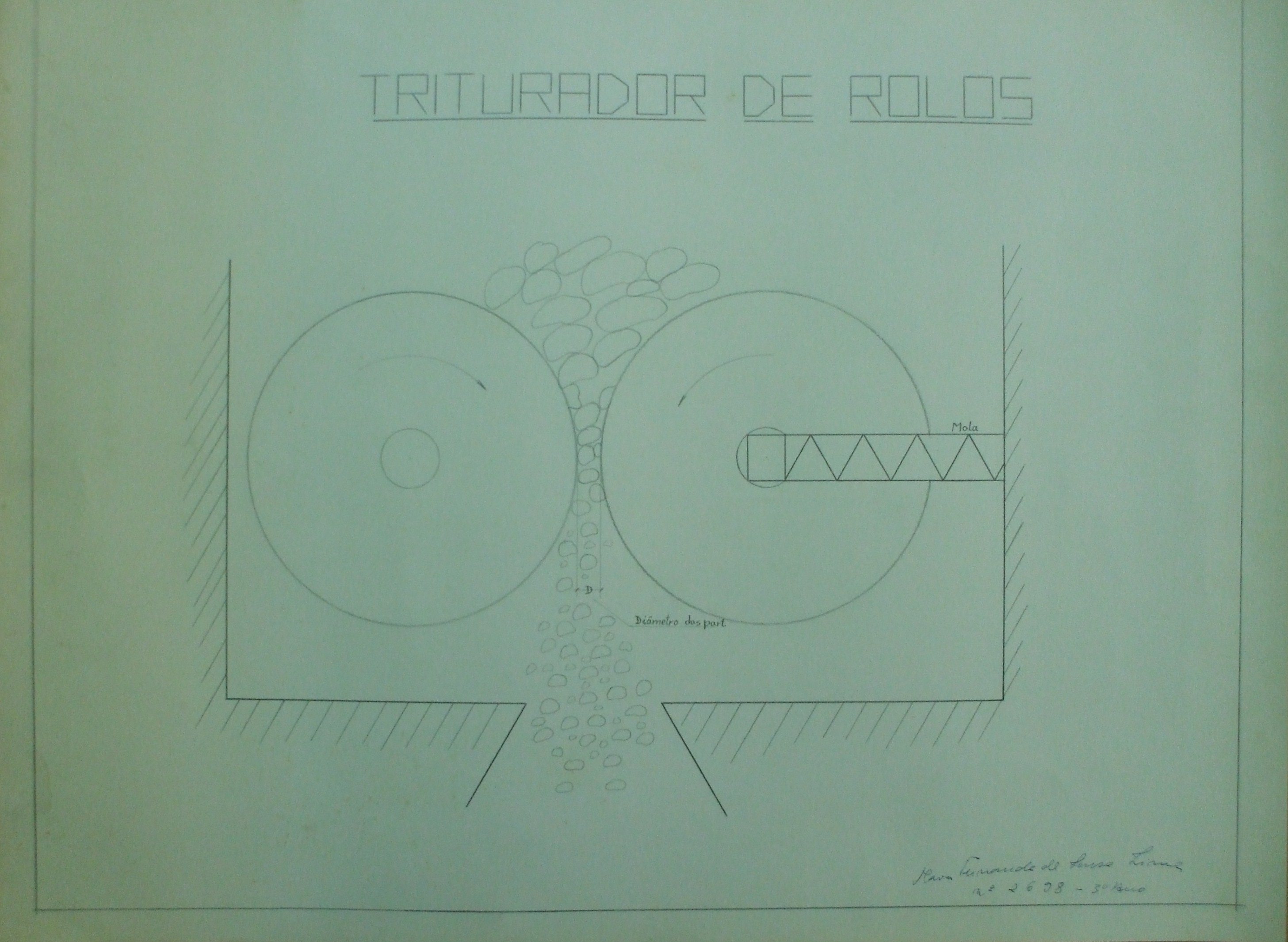 | Descrição: | O trabalho representa um triturador de rolos. O desenho demonstra a entrada dos materiais de grandes proporções e a saída do material em pequenas partículas. |