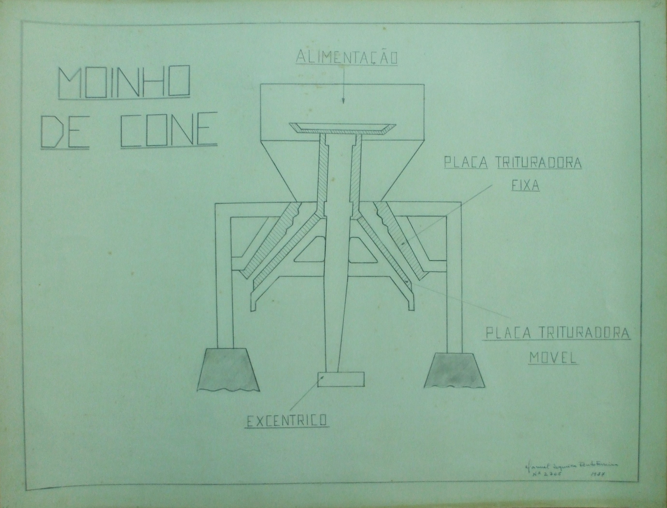 | Descrição: | O trabalho curricular representa um Moinho de Cone. A figura foi legendada com as algumas peças que constituem o moinho, respectivamente: o cone (local onde é alimentado o moinho), a placa trituradora fixa, a placa trituradora móvel e o excêntrico. |