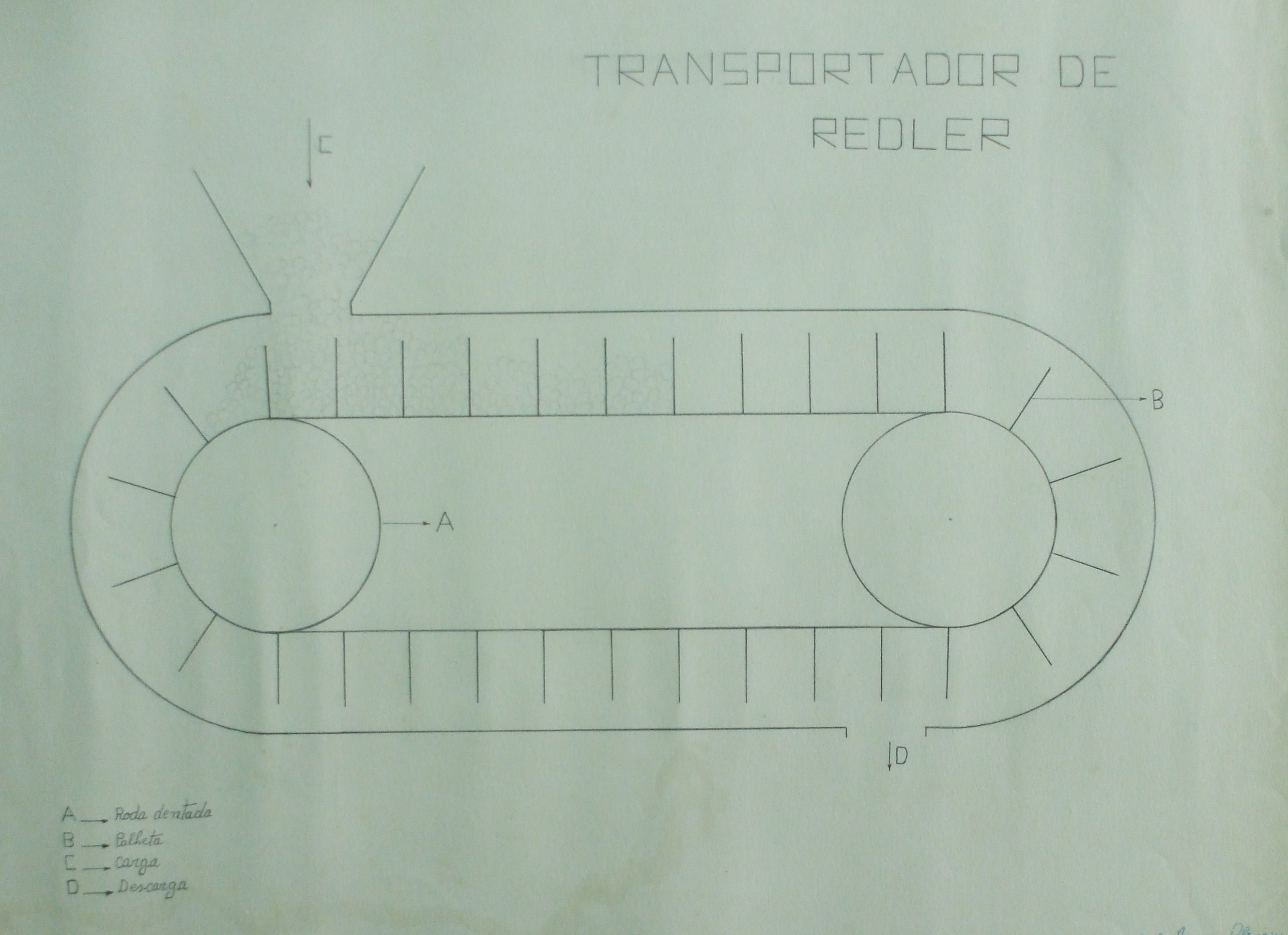 | Descrição: | O trabalho representa um transportador de Redler. Os transportadores Redler, ou de Arraste, são equipamentos industriais desenvolvidos para transporte horizontal de materiais sólidos. O trabalho esta legendado com as letras A, B, C e D, sendo: A - Roda Dentada; B - Palheta; C - Carga; D - Descarga; |