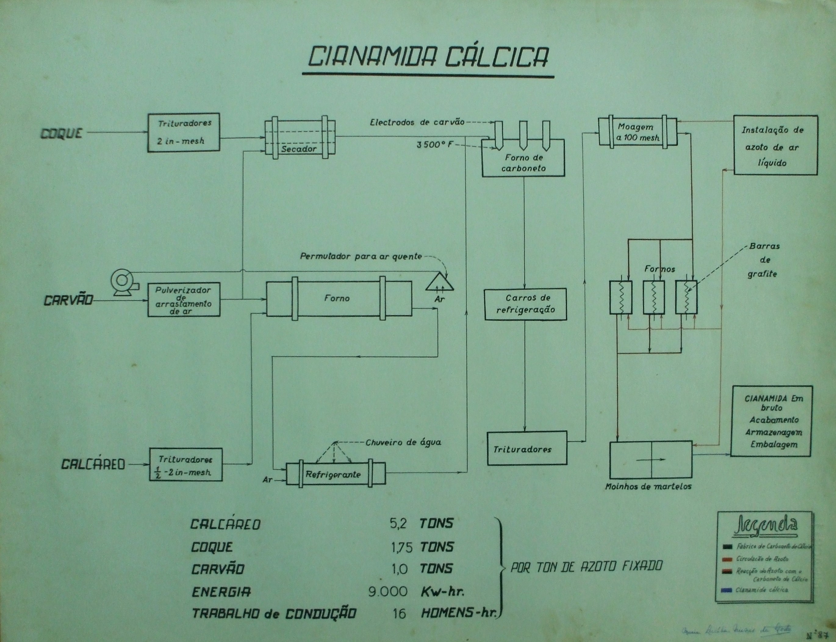 | Descrição: | O trabalho representa o esquema de produção da Cianamida Cálcica. No trabalho, canto inferior direito, contém a legenda do esquema. |