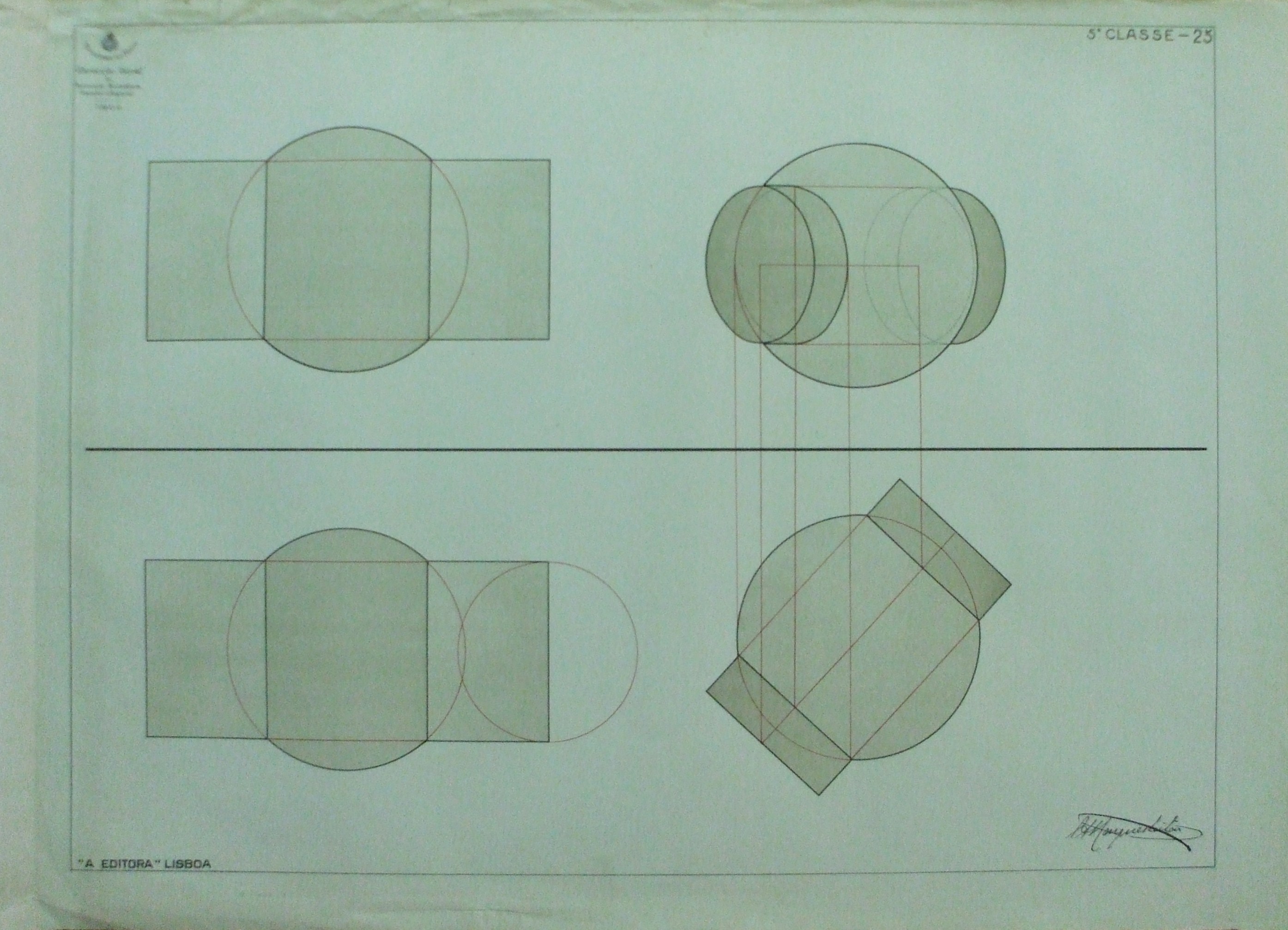 | Observações: | A estampa contém as seguintes informações: No canto superior esquerdo: Imagem do Brasão de Portugal "Ministério do Reino; Direcção Geral da Instrucção Secundária, Superior e Especial; 1909" No canto inferior esquerdo: "A EDITORA" LISBOA No canto superior direito: "5ª Classe -25" No canto inferior direito: Assinatura do Autor: C.A.Marques Leitão É atribuída o nº 25 à estampa, no entanto, no Livro de Desenho (Livro V), corresponde o desenho do lado esquerdo à estampa n. 37, desenho nr. 2 e o desenho do lado direito da estampa ao nº.38 , desenho nr.1. |