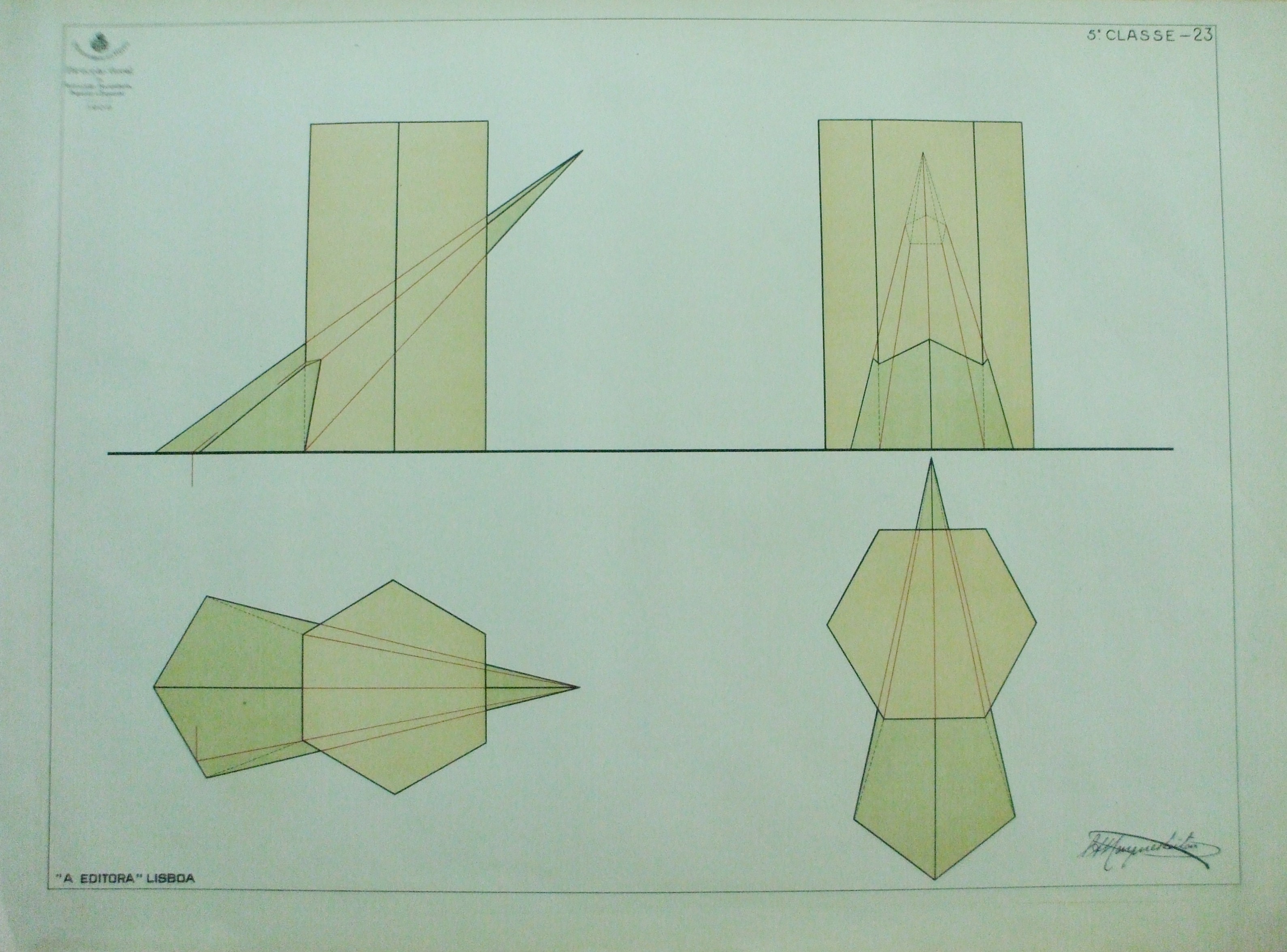 | Descrição: | Estampa Nr. 23 - 5ª Classe A estampa contém dois conjuntos de desenhos que representam: - Interseção de um prisma com uma pirâmide, estando os mesmo sólidos representados em duas posições. |