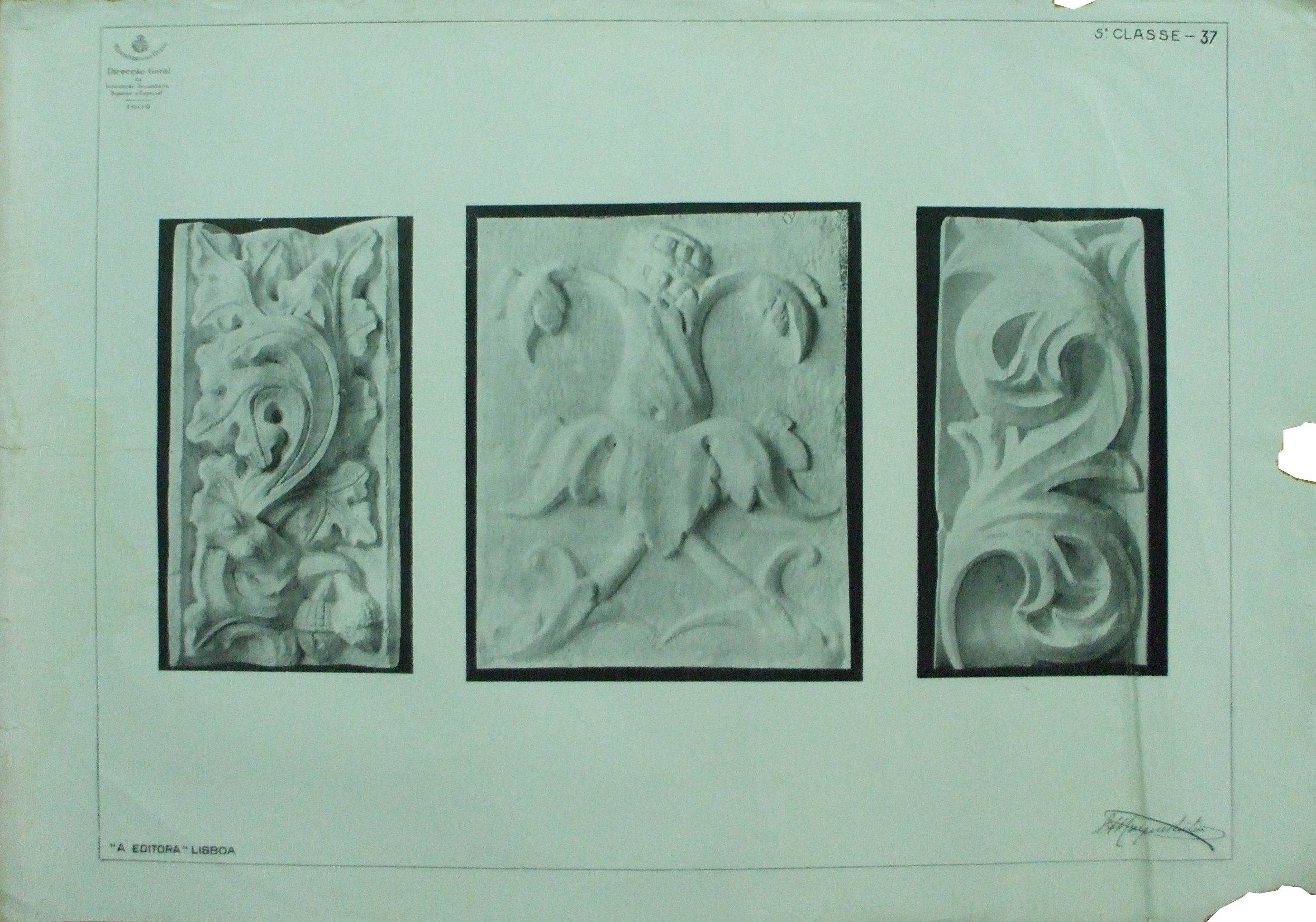 | Observações: | A estampa contém as seguintes informações: No canto superior esquerdo: Imagem do Brasão de Portugal "Ministério do Reino; Direcção Geral da Instrucção Secundária, Superior e Especial; 1909" No canto inferior esquerdo: "A EDITORA" LISBOA No canto superior direito: "5ª Classe -37" No canto inferior direito: Assinatura do Autor: C.A.Marques Leitão É atribuída o nº 37 à estampa, no entanto, no Livro de Desenho (Livro V), corresponde à estampa 63. |