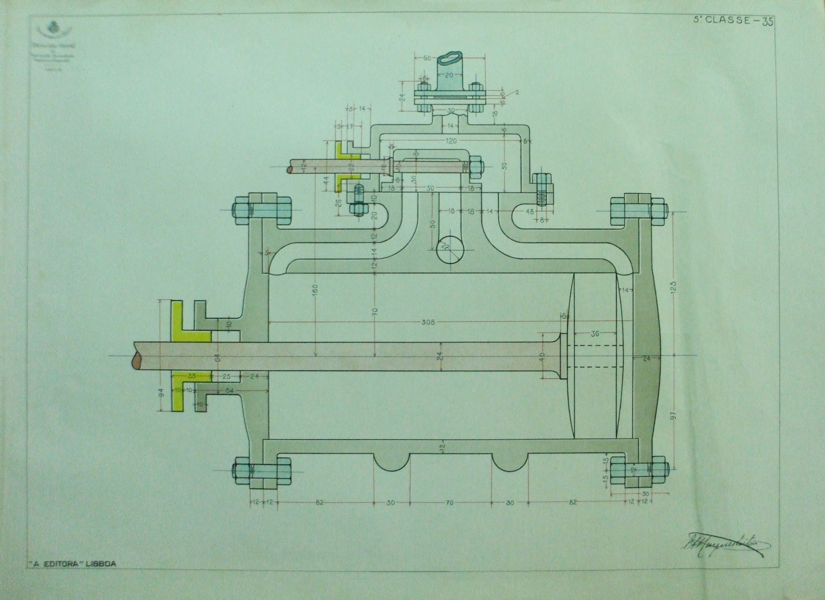 | Descrição: | Estampa 35 - 5ª Classe A estampa representa um modelo dum equipamento de distribuição de vapor. Este exemplo representa desenhos de orgãos de máquinas, que estão em harmonia com o modo educativo que o desenho desempenha no ensino. A figura da estampa representa um complemento de precisão e nitidez que o desenho geométrico requer, acessível pela variedade das formas e pela interpretação dos determinados cortes ou seções para a pratica da execução do modelo que se quer representar. |