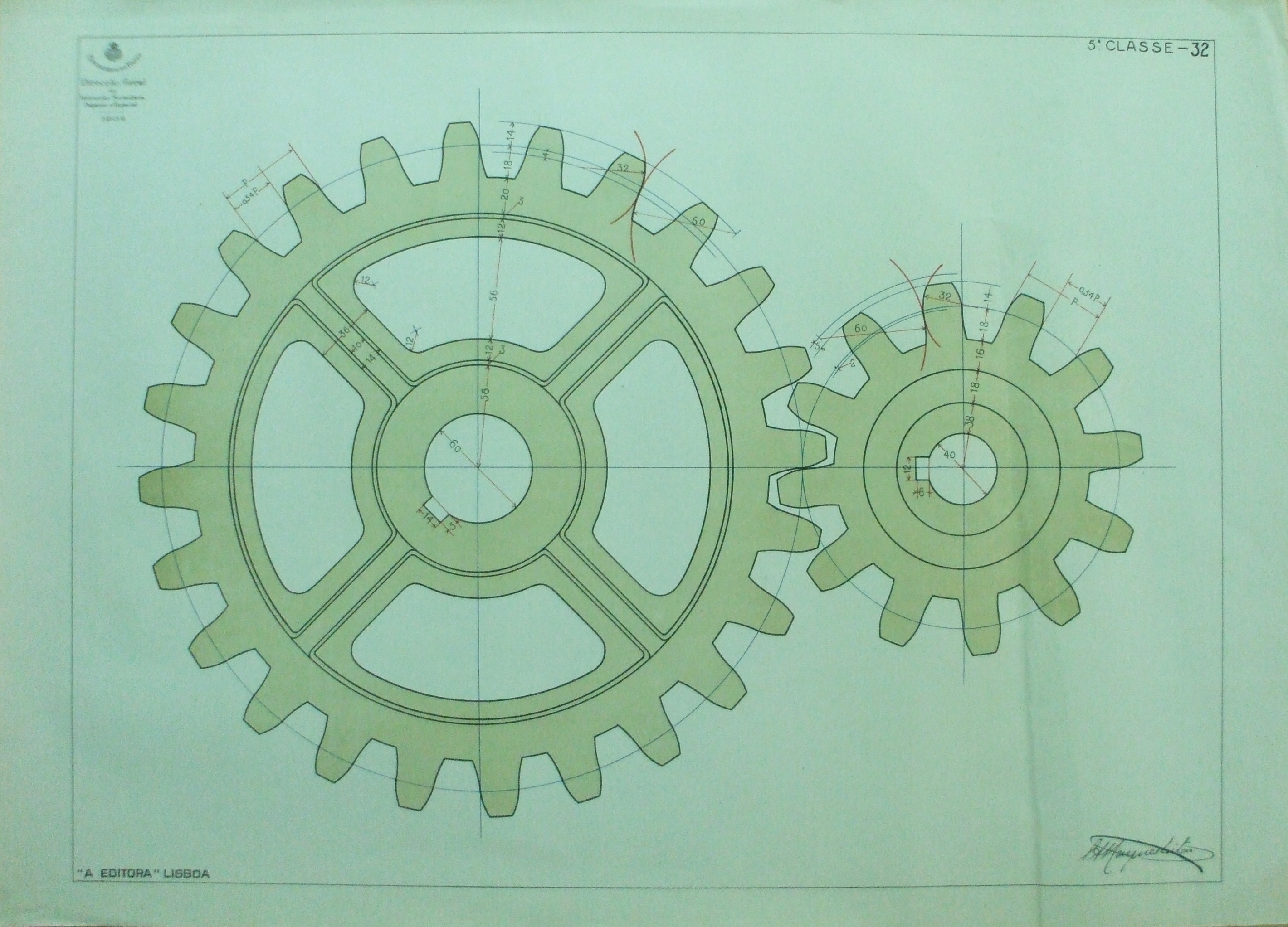 | Descrição: | Estampa 5ª Classe -32 A estampa representa um par de engrenagens. O desenho representado está em conformidade com a função educativa que o desenho tem a desempenhar na instrução secundária. O desenho possui precisão e nitidez que o desenho geométrico requer, assim como a variedade das formas e a interpretação de determinados cortes ou seções para a prática da execução do modelo de desenho que se pretende representar. |