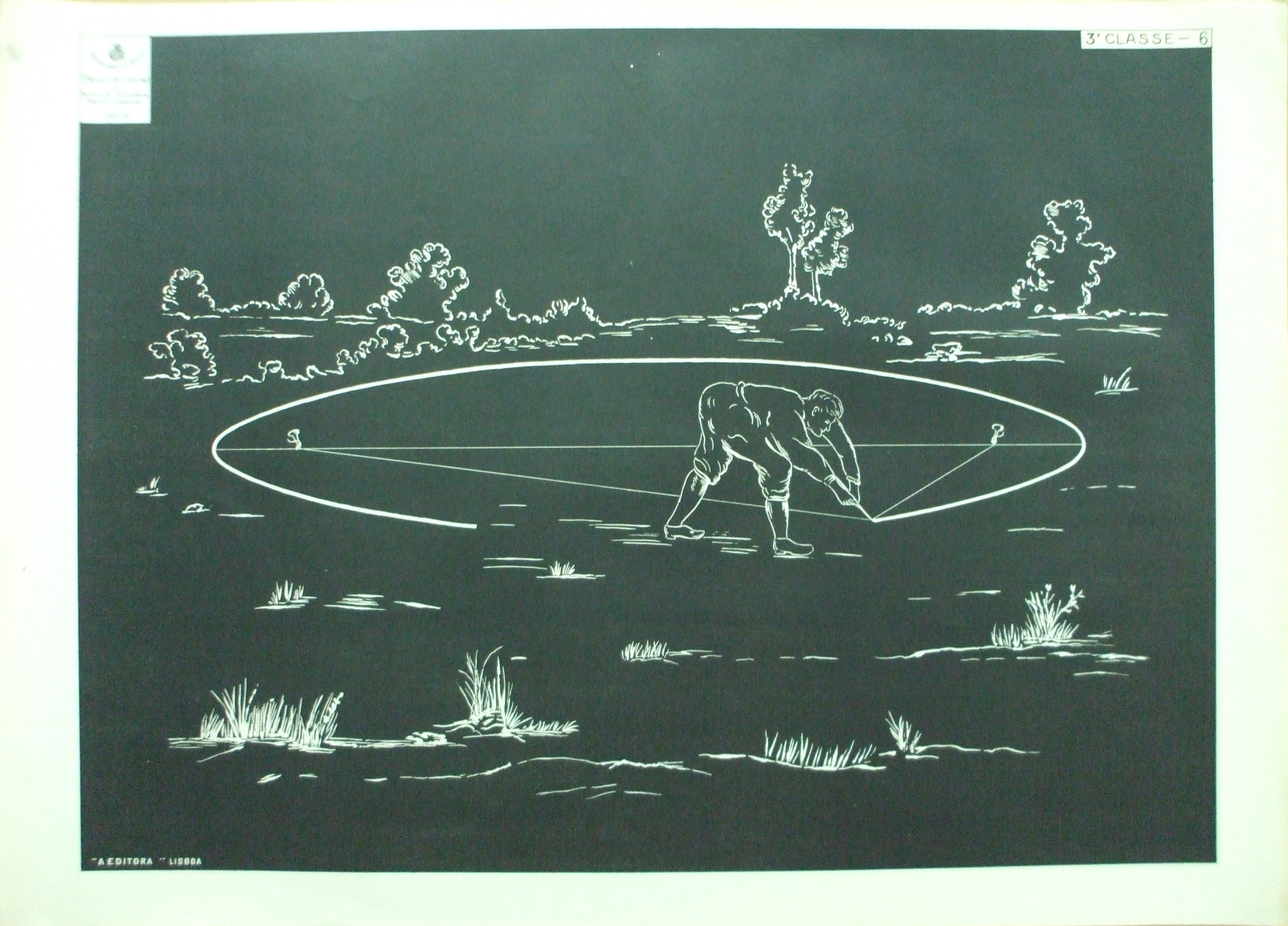 | Descrição: | Estampa 3ª Classe - 6 A estampa representa o processo para traçar uma elipse no terreno. Esse processo executa-se da seguinte forma: mede-se com um cordel a grandeza do eixo maior e fixando as suas extremidades nos focos. Estende-se o cordel com um ponteiro, conservando-o sempre bem tenso, o ponteiro posto em movimento, vai traçando a curva no terreno. |