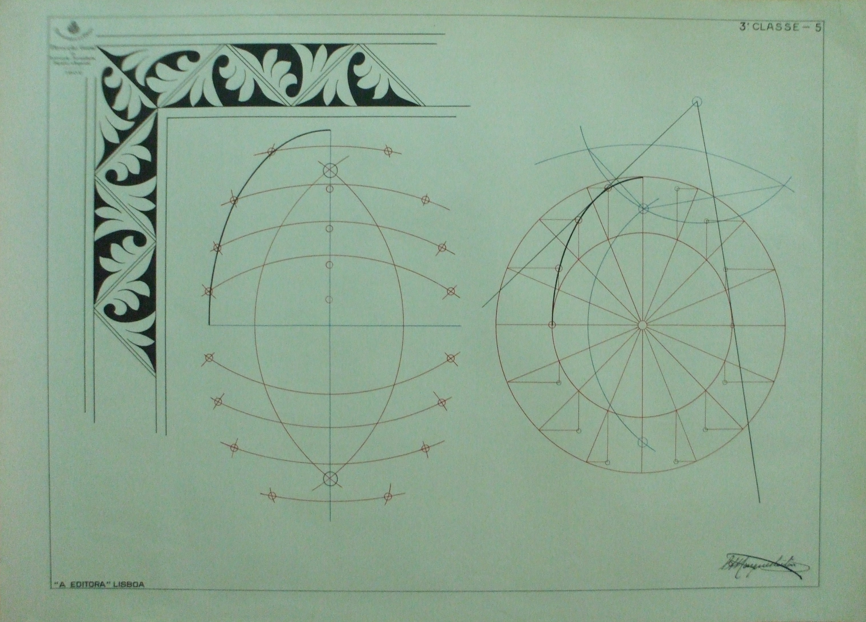 | Descrição: | Estampa 3ª Classe - 5 A estampa contém três imagens, das quais, duas representam o traçado duma elipse. A terceira figura representa um ornamento decorativo , com motivos vegetais. |