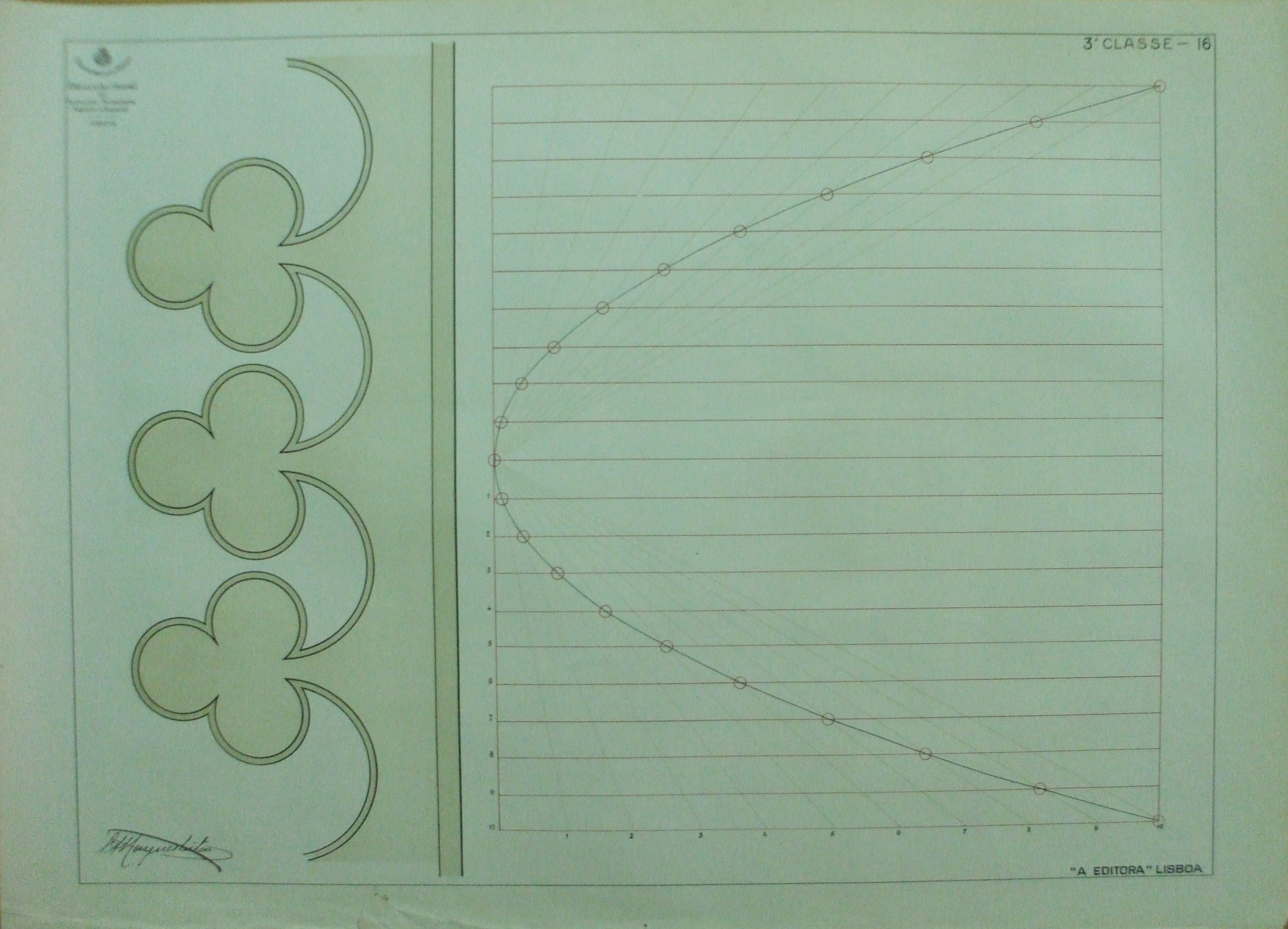 | Observações: | A estampa contém as seguintes informações: No canto superior esquerdo: Imagem do Brasão de Portugal "Ministério do Reino; Direcção Geral da Instrucção Secundária, Superior e Especial; 1909" No canto inferior esquerdo: Assinatura do autor: C.A.Marques Leitão No canto superior direito: "3ª Classe - 16" No canto inferior direito: "A EDITORA" LISBOA É atribuída o nº 16 à estampa e confere com o Livro de Desenho (Livro III). |