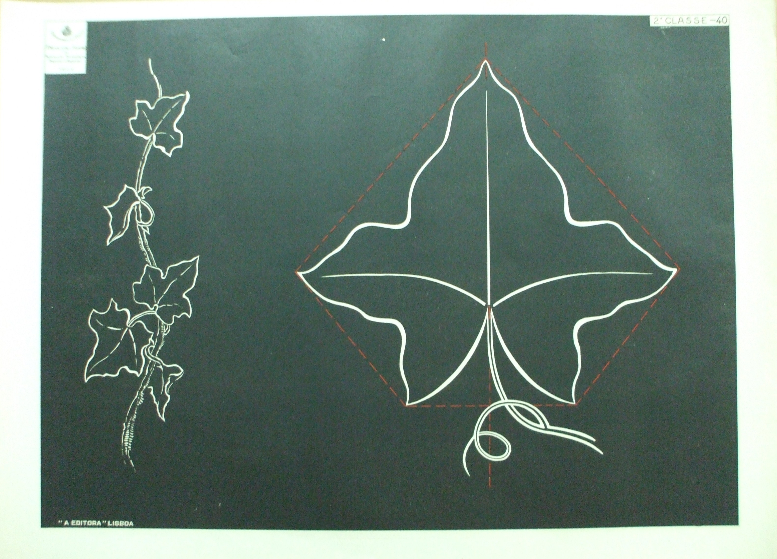 | Descrição: | Estampa 2ª Classe - 40 A estampa contém dois desenhos que representam, respetivamente, um ramo de hera e uma folha isolada em escala maior. Estes motivos vegetais eram utilizados para decoração de edificios, pinturas, entre outros. |